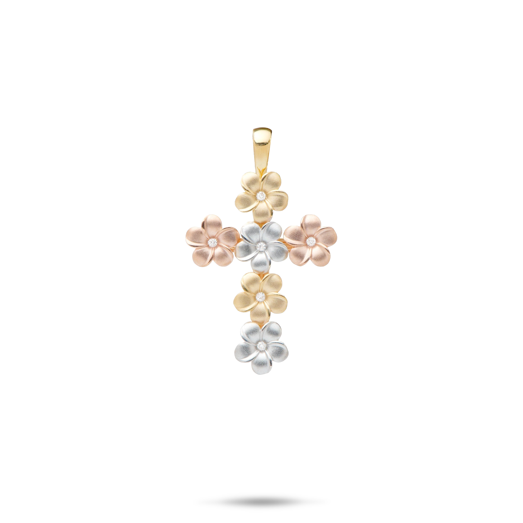 Plumeria Cross Pendant in Tri Color Gold with Diamonds - 25mm