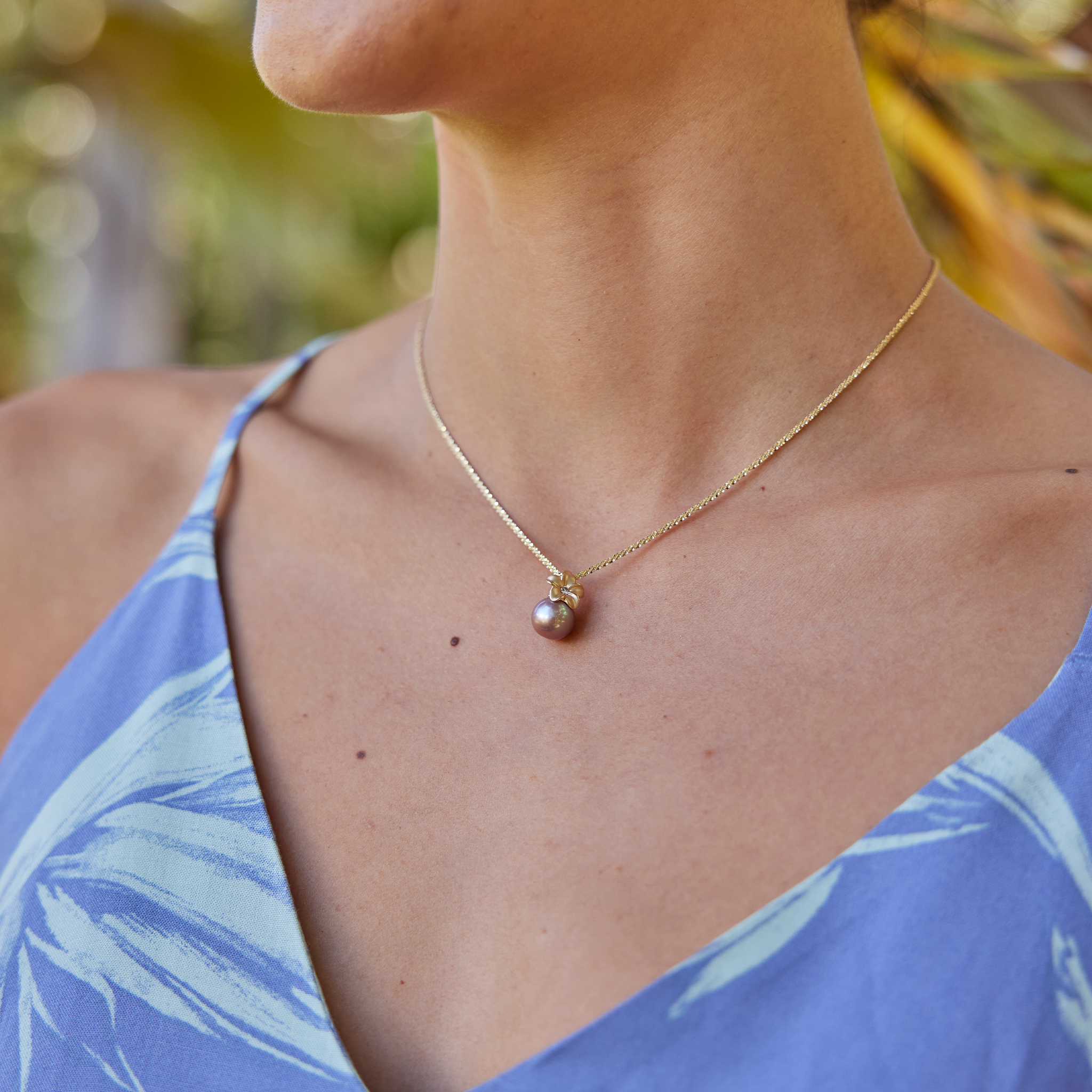 プルメリア ライラック 淡水パール ペンダント ダイヤモンド ゴールド 9-10mm