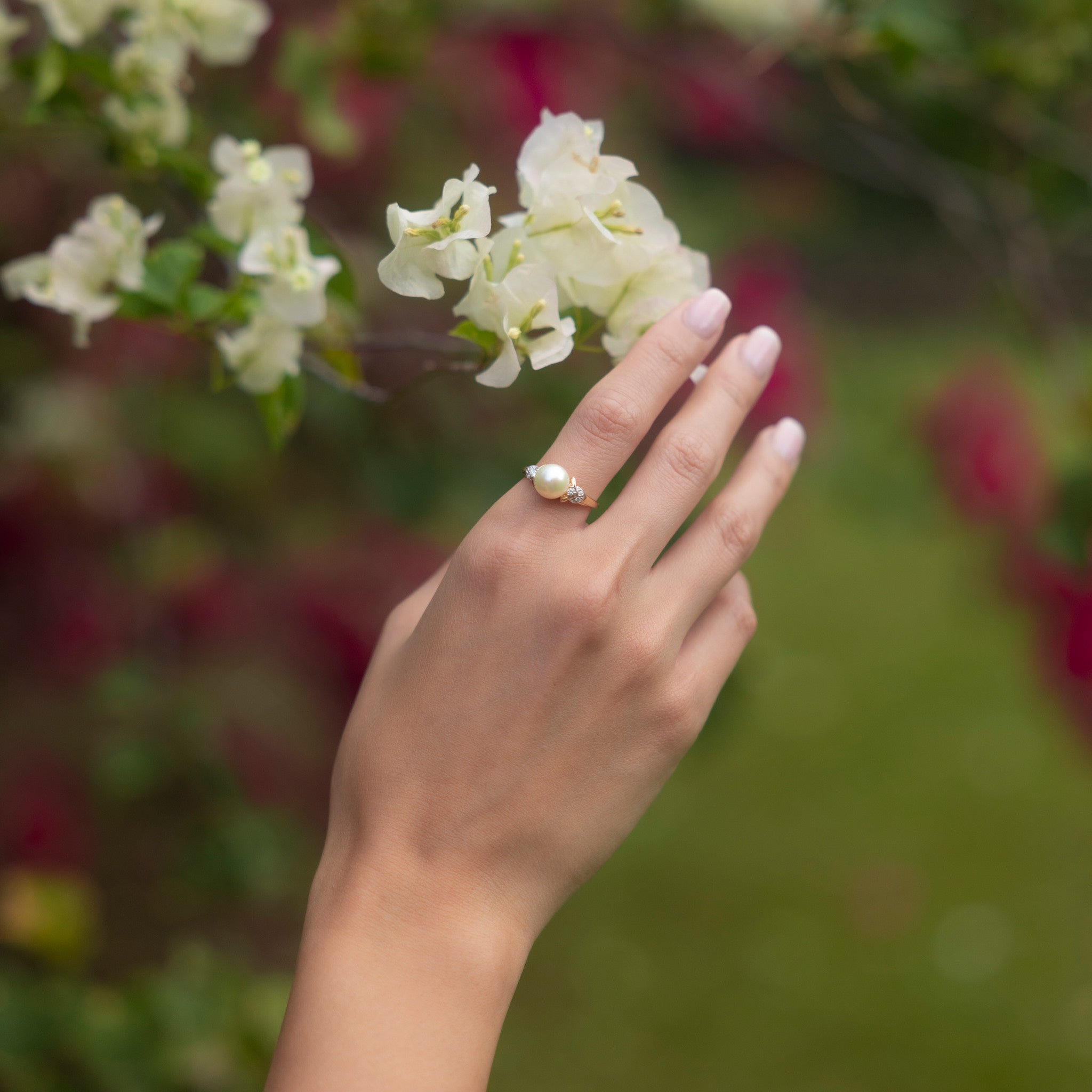 Nothing is more classic than white pearls and this lovely white freshwater pearl ring is a perfect choice. With sparkling diamonds on each side of the rose gold band, this pearl ring is a sight to behold.