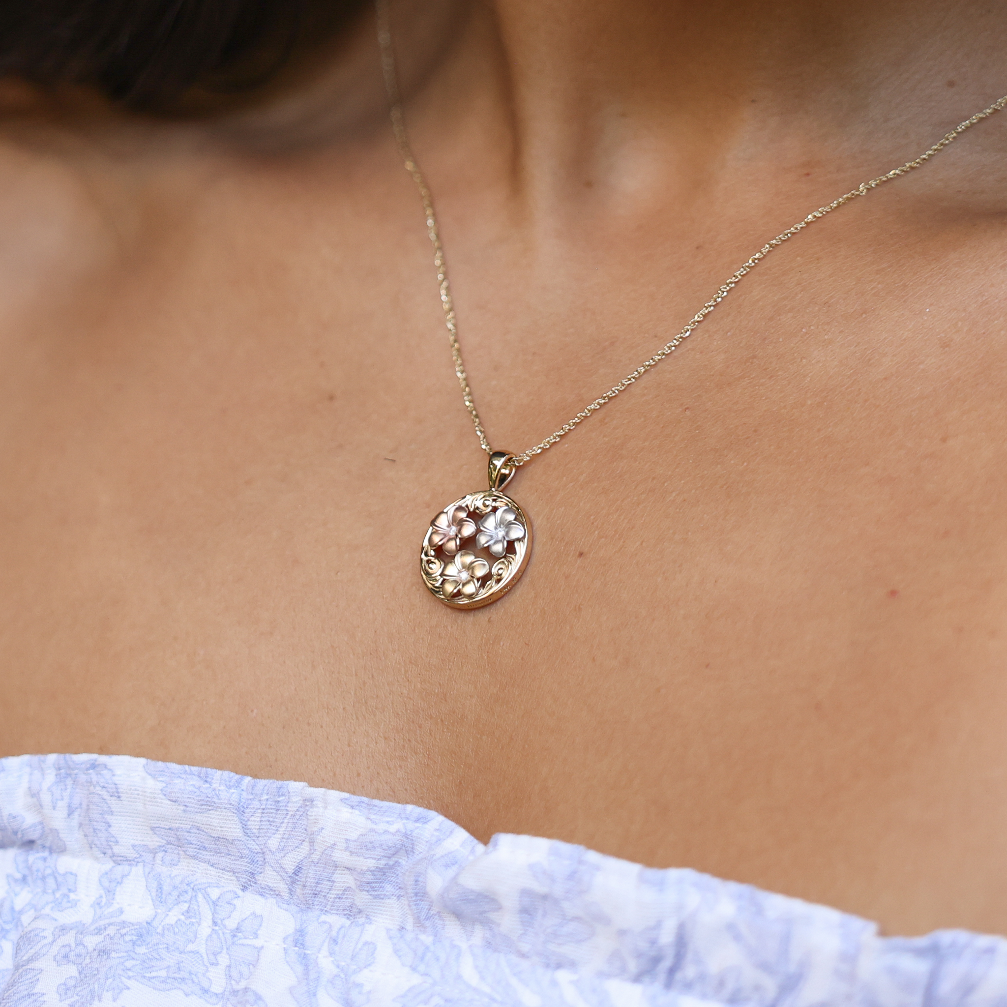 Hawaiian Heirloom Plumeria Pendant in Tri Color Gold with Diamonds - 18mm