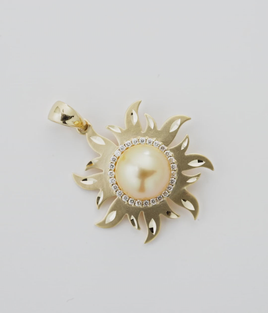 Radiate the warmth of Hawaiʻi with the Sun Pendant. Crafted with a shimmering satin finish and flared diamond cut design, the sun pendant goes unnoticed with sparkling natural diamonds and a luxurious South Sea Gold pearl.