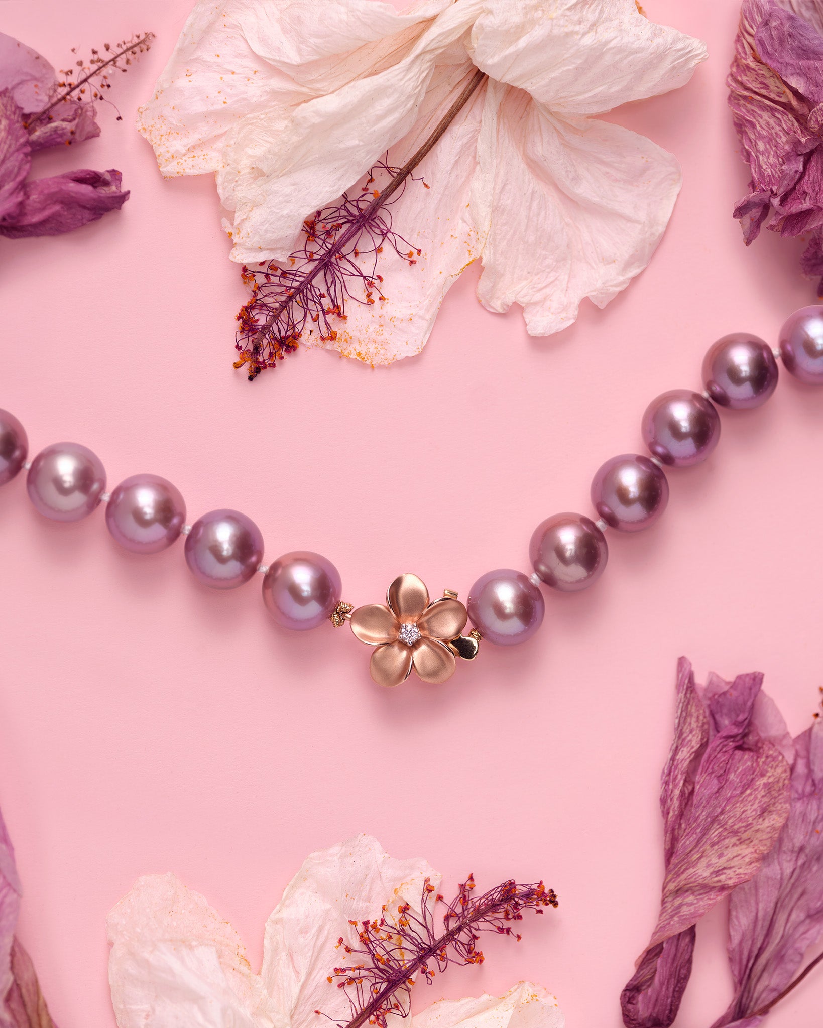 Plumeria Lavender Freshwater Pearl Earrings in Gold with Diamonds - 9-10mm
