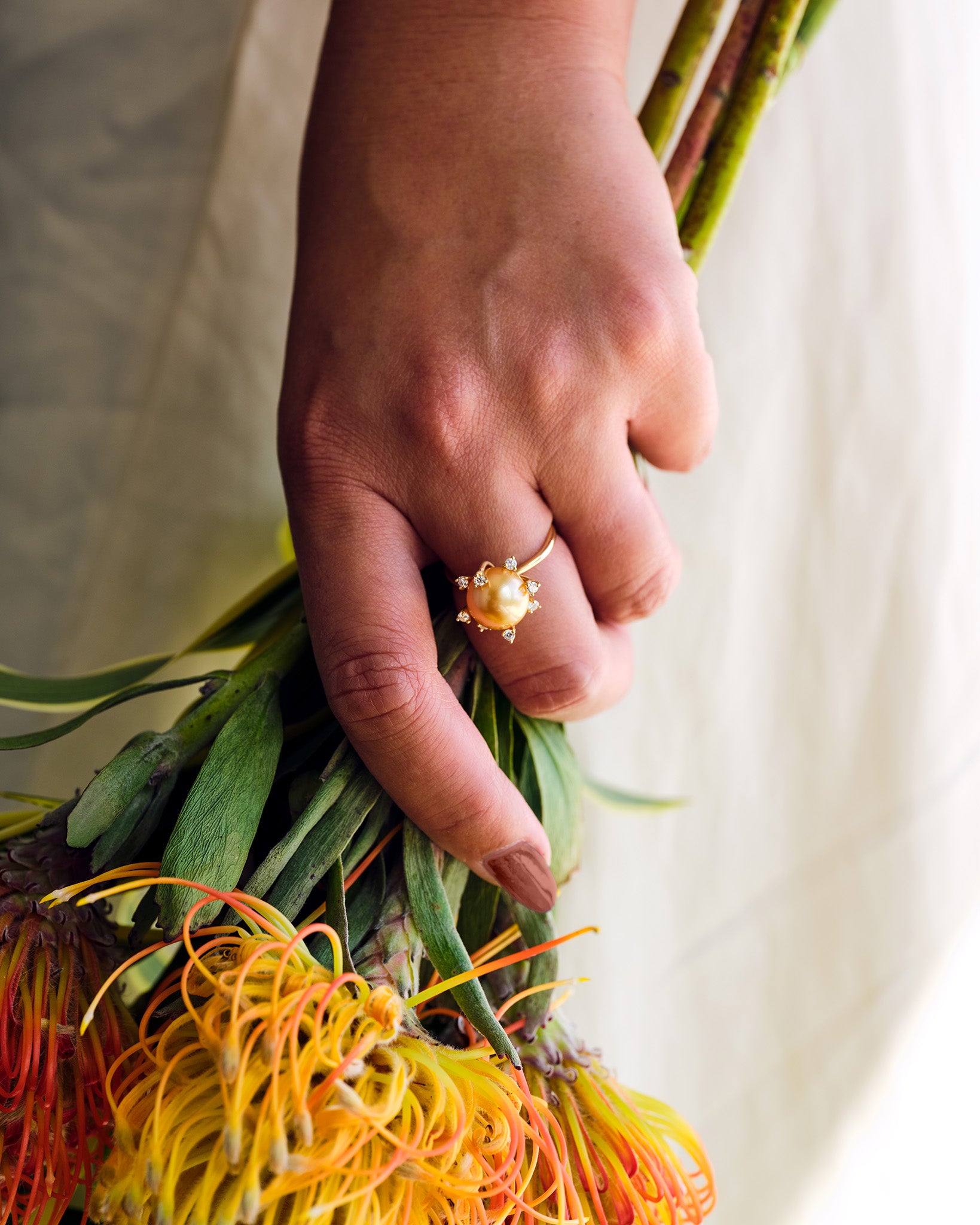 E Hoʻāla Akoya White Pearl Ring in Gold with Diamonds - 21mm
