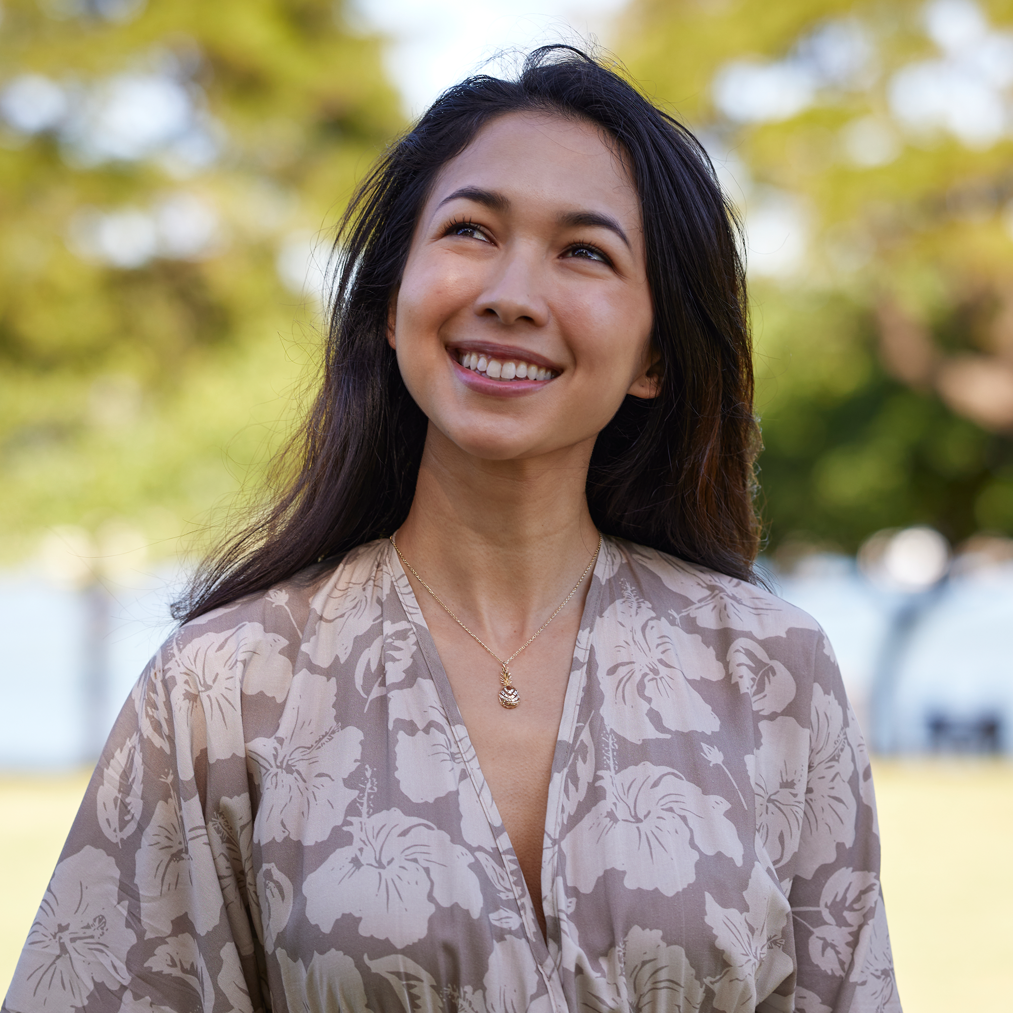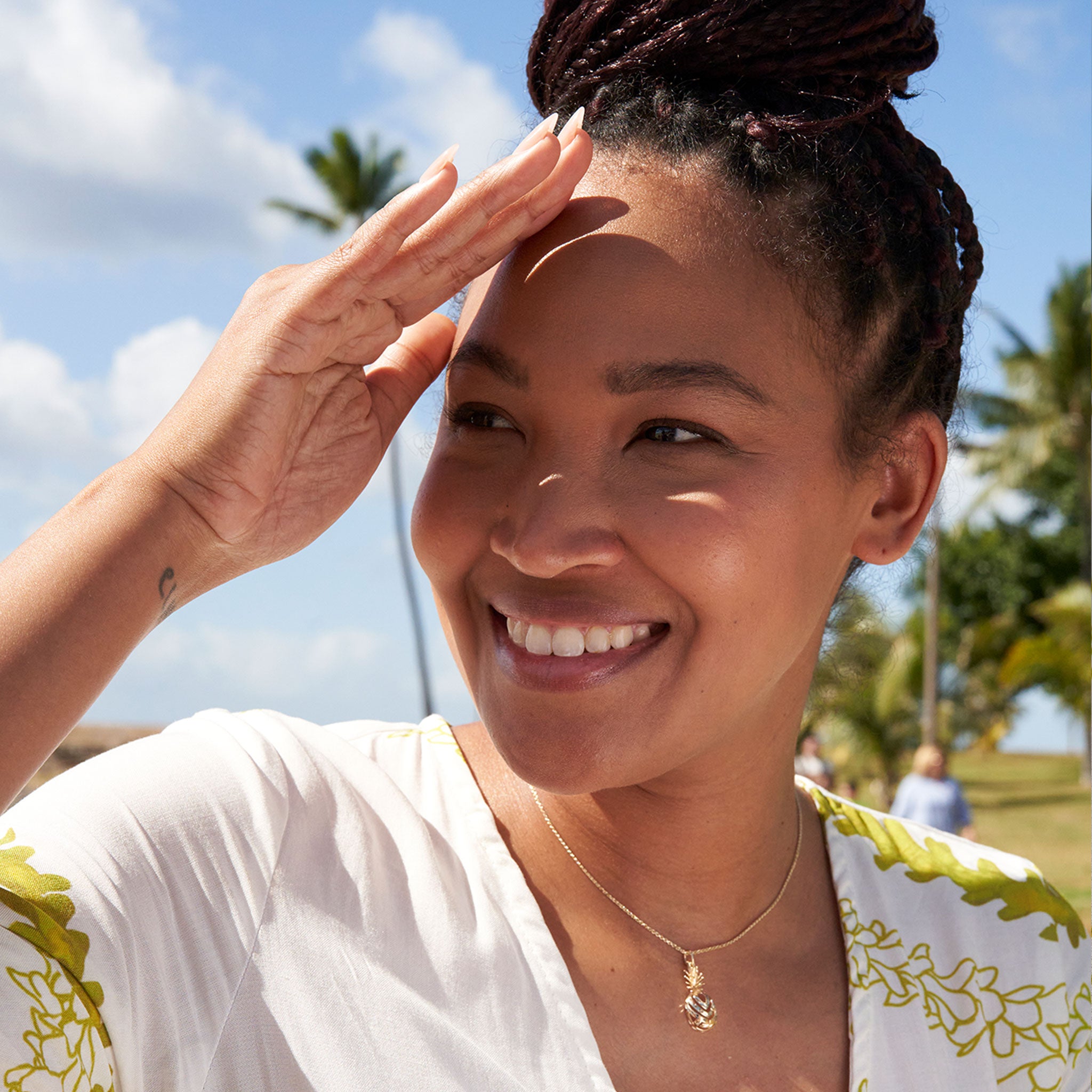 アロハ・パイナップル・ペンダントで、アロハの甘いメッセージをいつも持ち歩きましょう。ダイヤモンド・カットが施されたペンダントには隠されたメッセージが。ペンダントに光を当てると、その影に「Aloha」の文字が浮かび上がります。