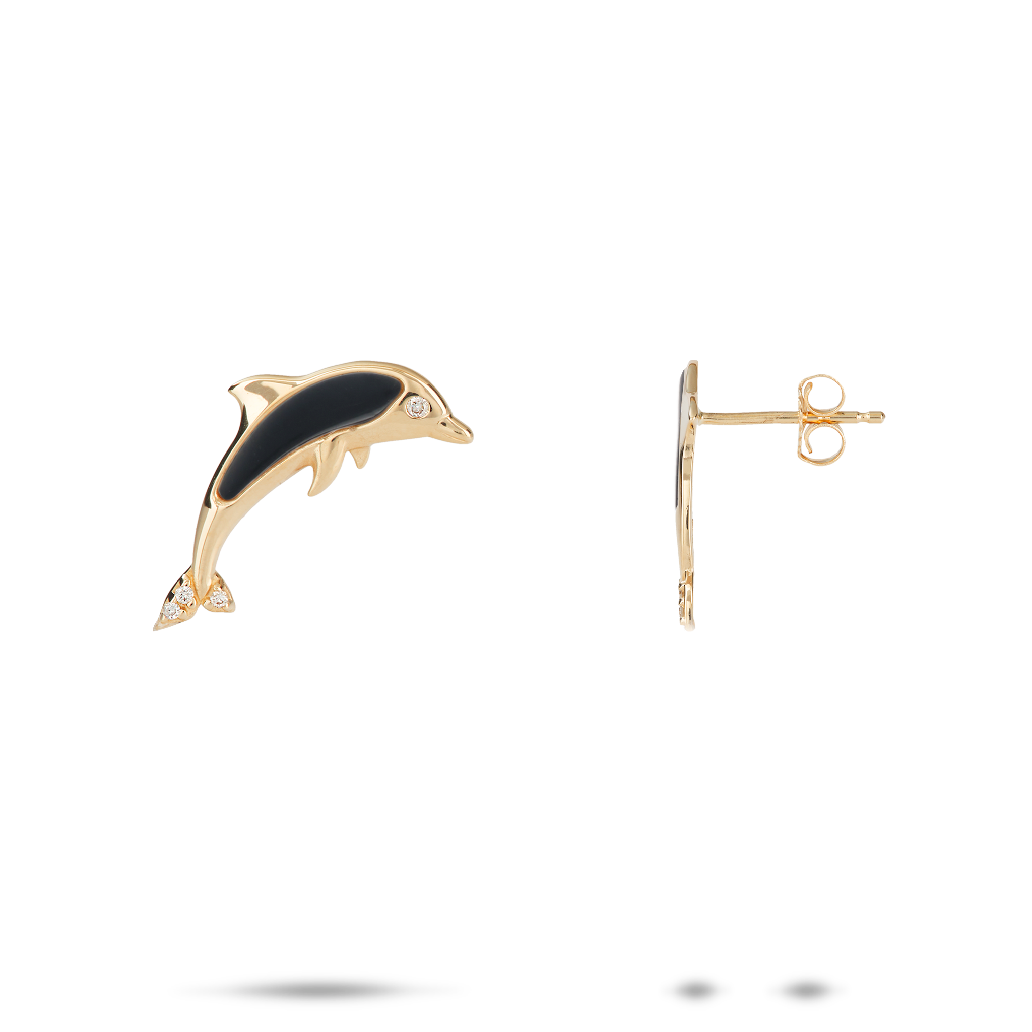 Sealife Dolphin Black Coral Earrings in Gold with Diamonds - 15mm