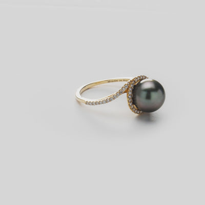 ヘイロー バイパス タヒチ黒真珠 ダイヤモンド ゴールド リング - 9-10mm