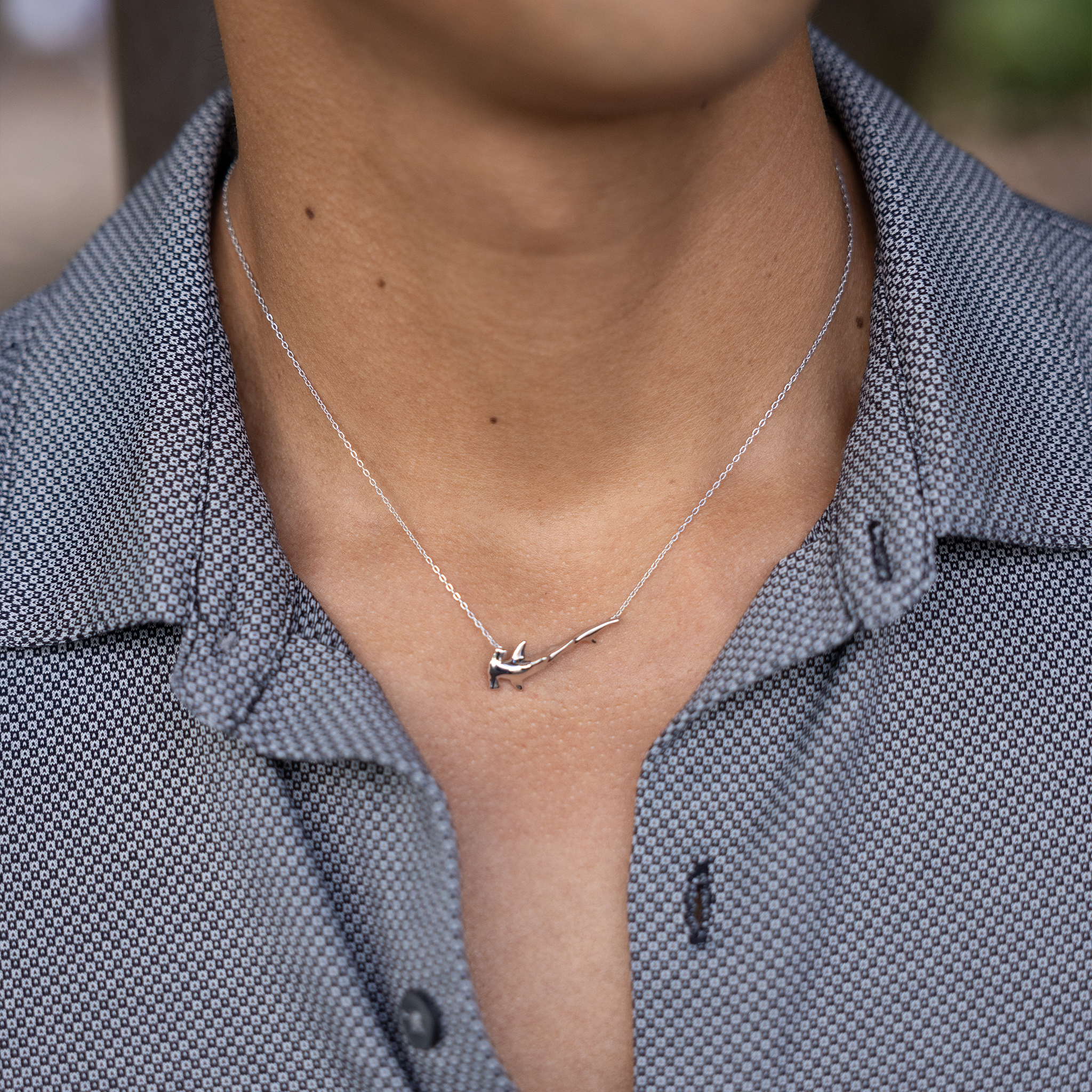 The Hammerhead Shark Necklace, crafted in sterling silver, features a sleek hammerhead shark design paired with a shimmering cable chain. Adjust the chain length to either 16 or 18 inches.