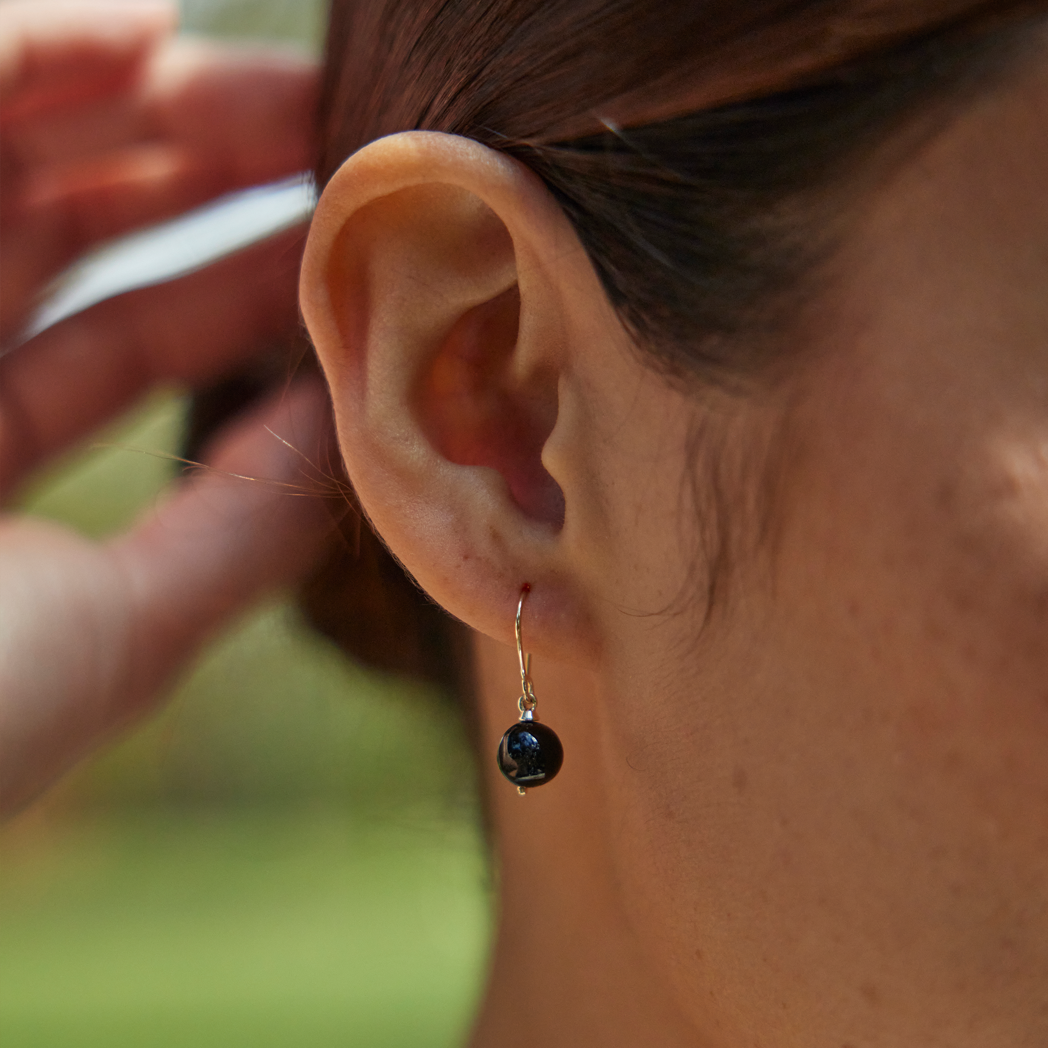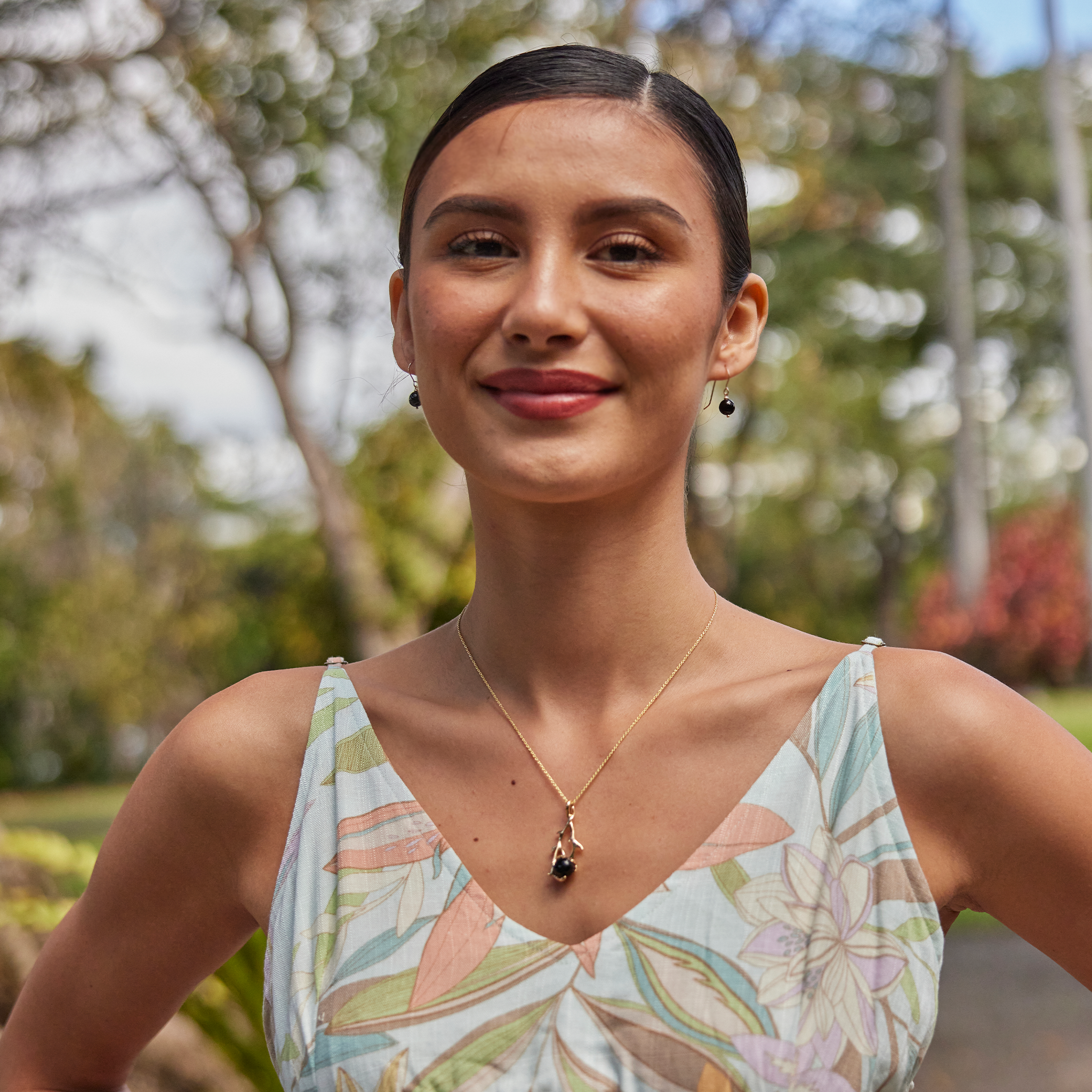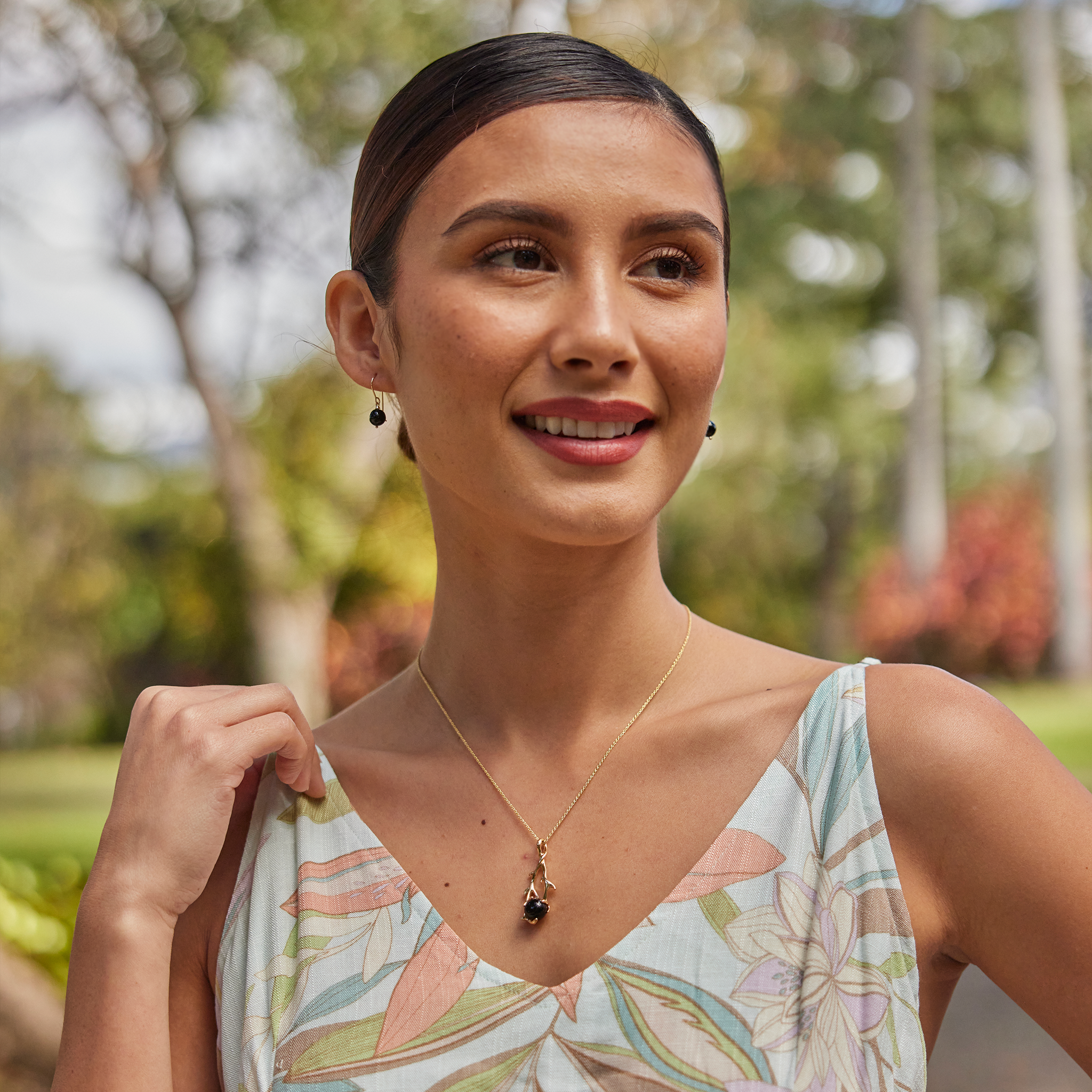 輝く14Kイエローゴールドに艶やかなビーズが映えるハワイアン・ブラックコーラル・イヤリング。大胆なエレガンスがあなたのスタイルにユニークな要素を加えます。