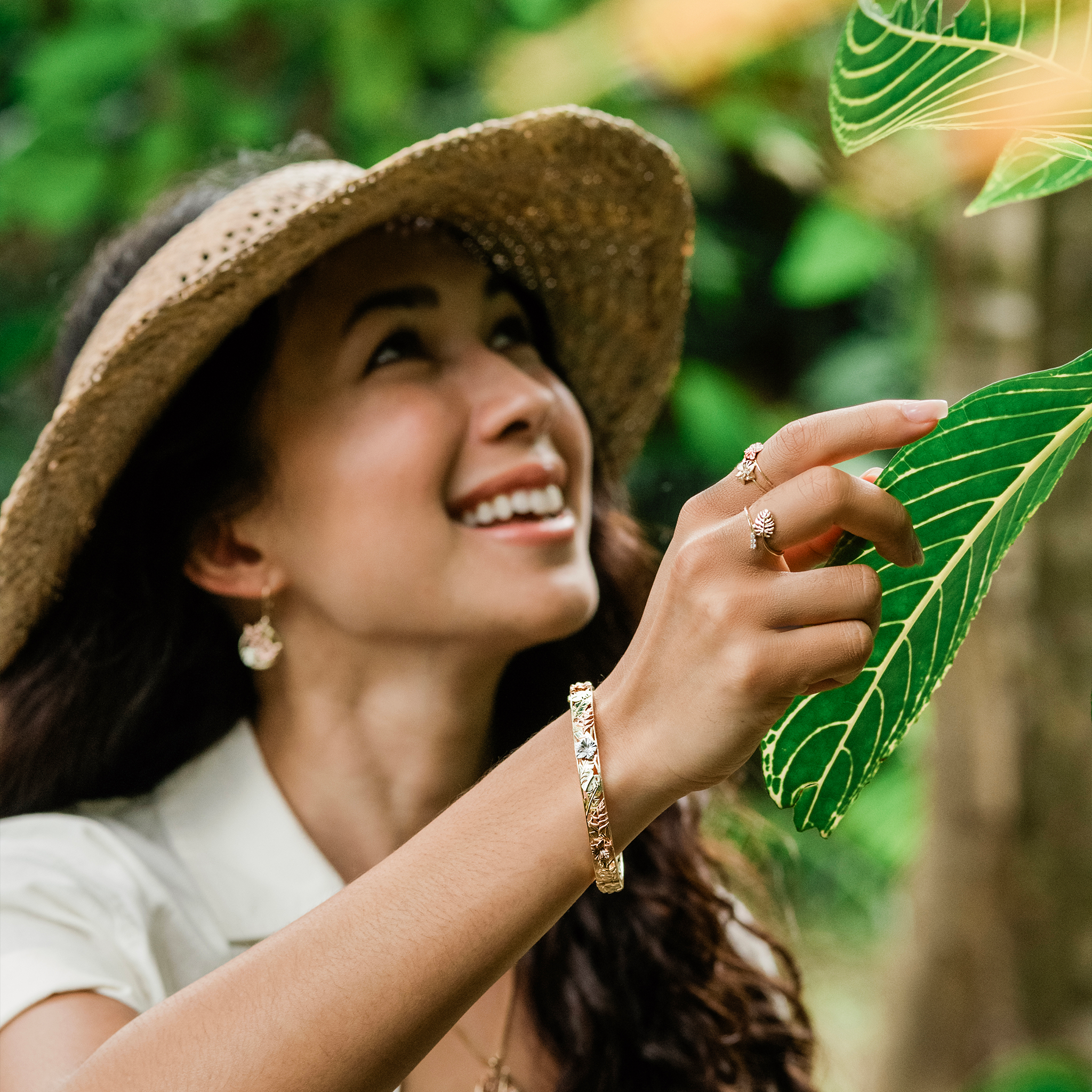 風にそよぐモンステラの花が、赤らんだヘリコニアや繊細なハイビスカスの花にそよぎ、満開のハワイアン・ガーデン。若々しい喜び、成長、冒険を象徴するトロピカルガーデンは、きらめくダイヤモンド、滑らかなサテン仕上げ、アクセントの効いたハイポリッシュ、そしてカラフルなゴールドで生命を吹き込みます。ハワイアン・ガーデンズ・コレクションで、あなたの中の探検家の心を解き放ちましょう。