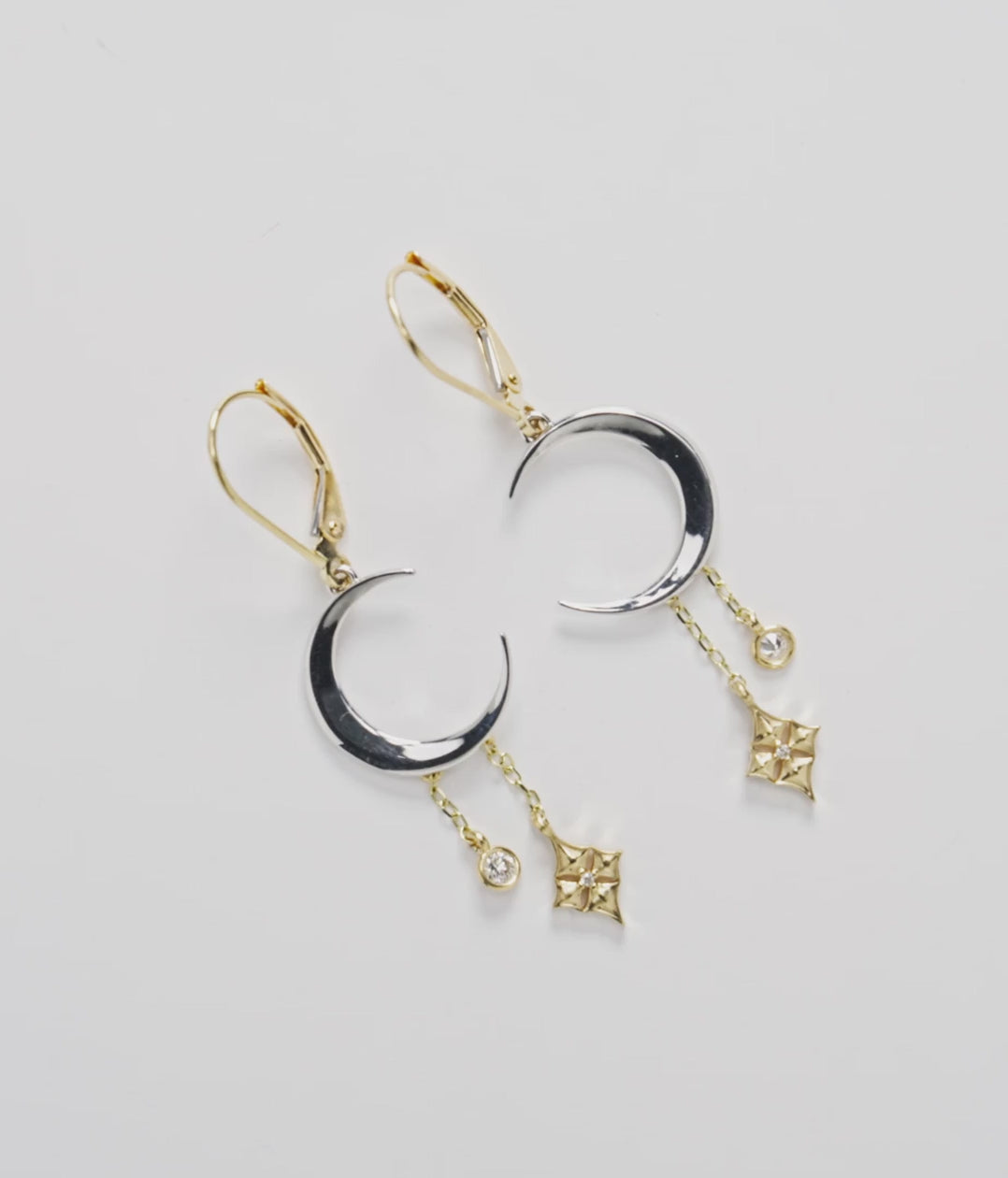 Hawaiian Quilted Star and Moon Earrings in Two Tone Gold with Diamonds - 35mm