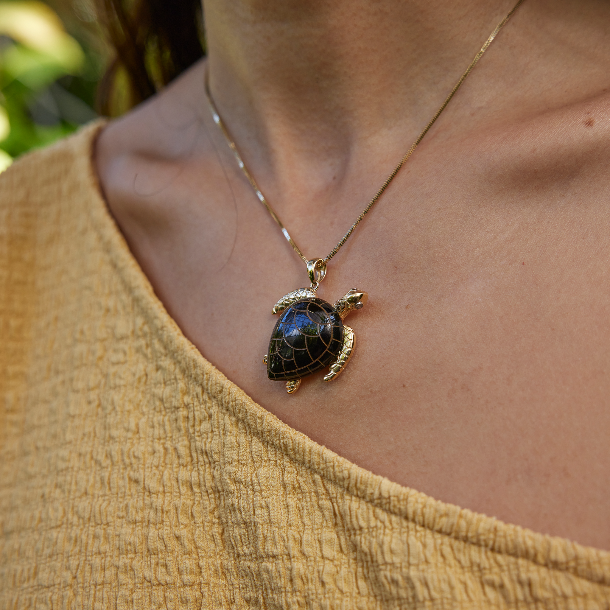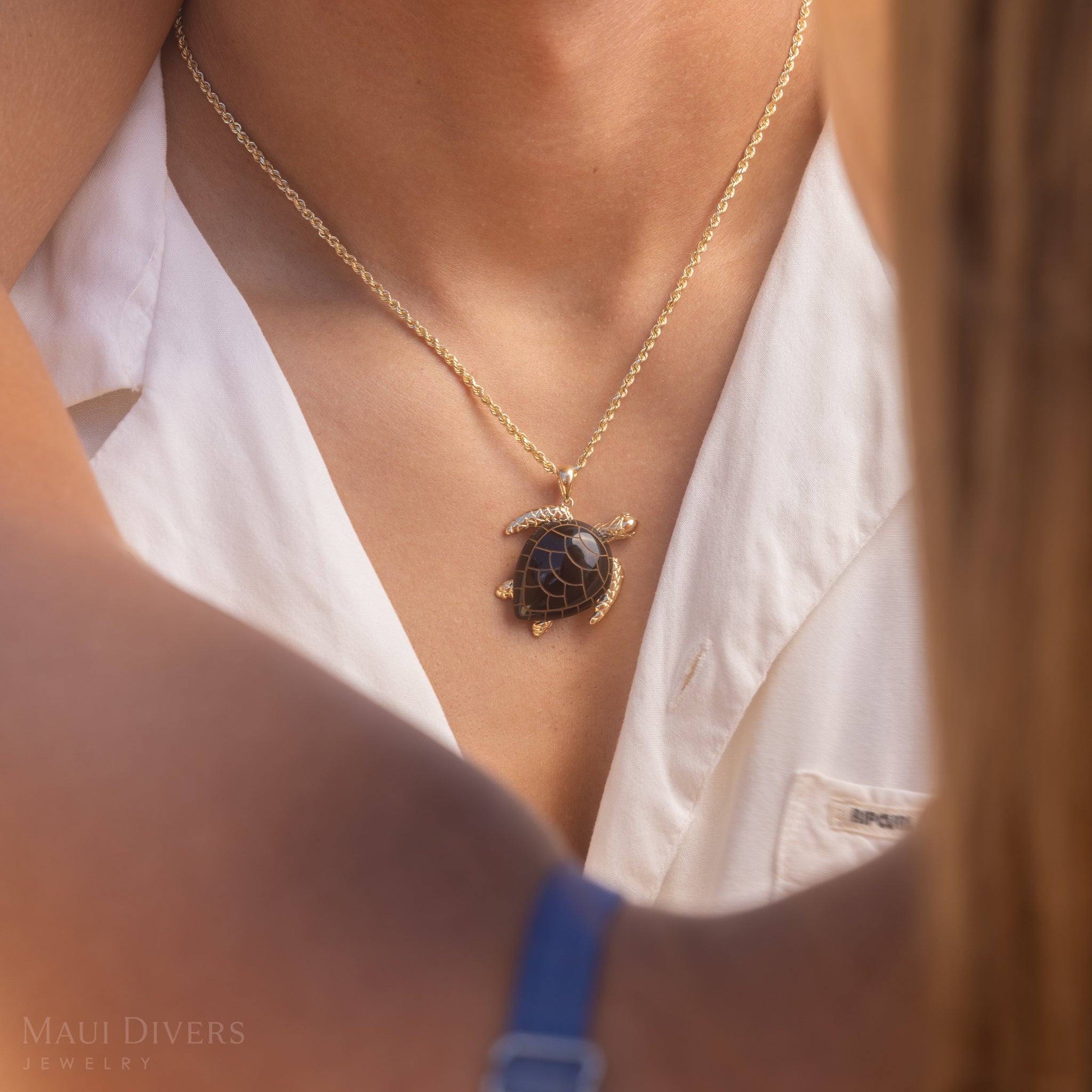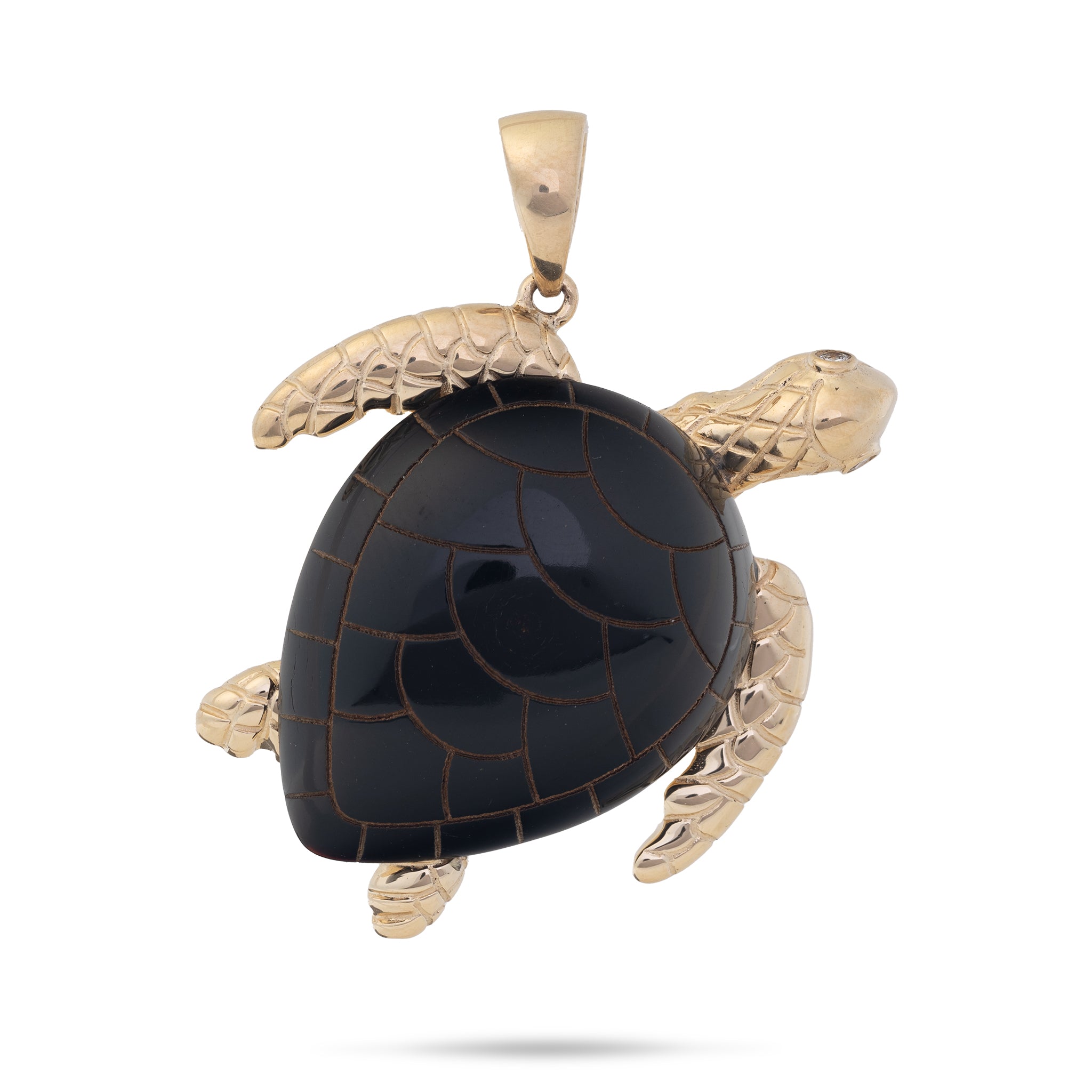 Honu Black Coral Pendant in Gold with Diamond - 30mm