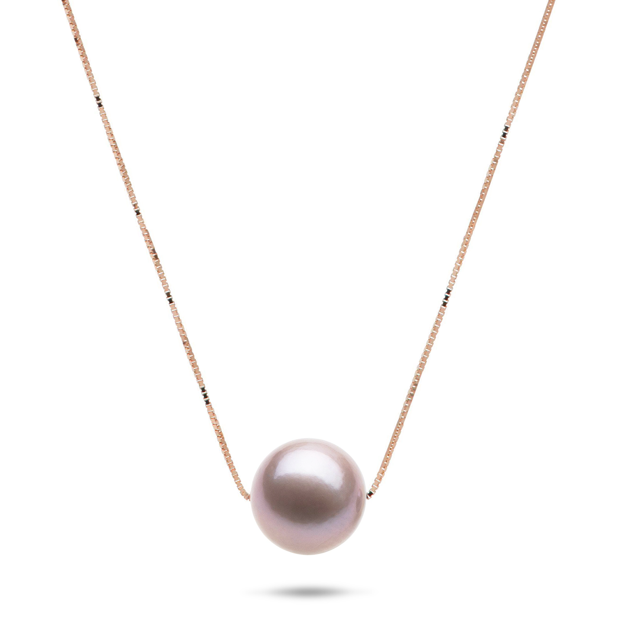 The mesmerizing lavender pearl necklace features a glimmering 14k rose gold box chain, creating a clean and simple look that is all about romantic hues.