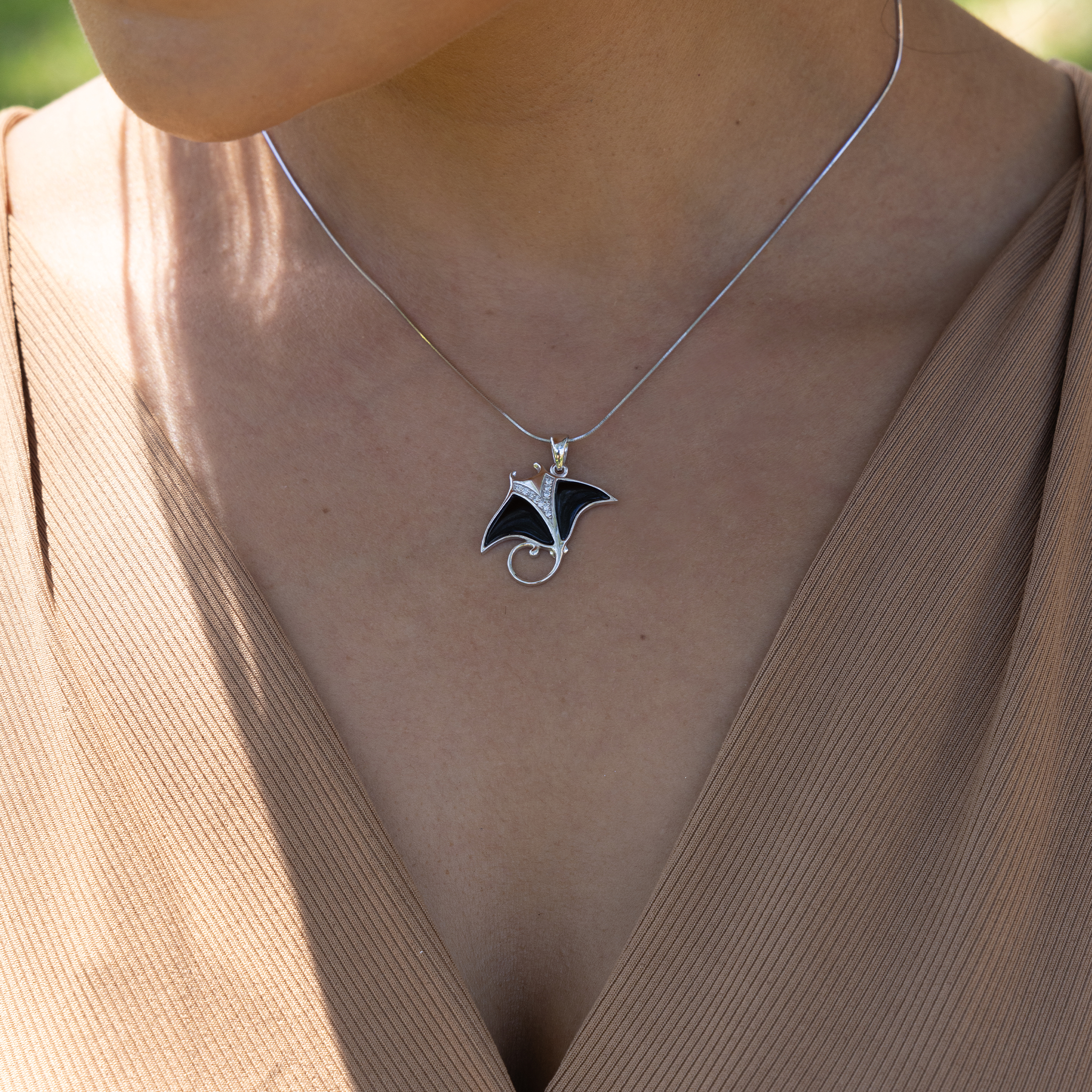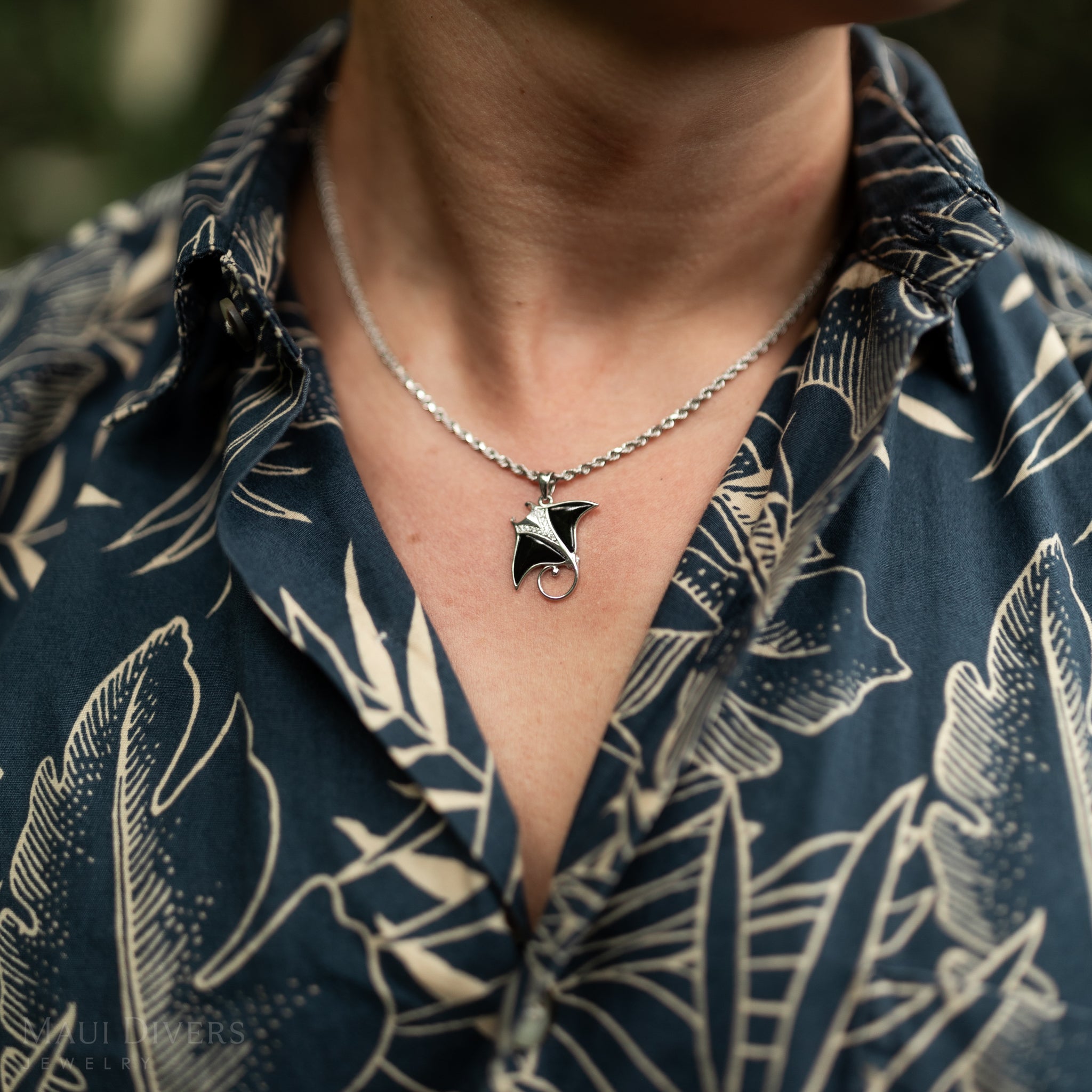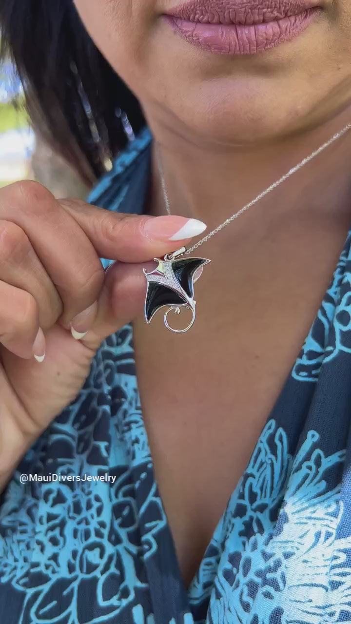 シーライフ・コレクションのマンタ・ペンダントは、ハワイ州の宝石、ブラックコーラル、ダイヤモンド、ゴールドがあしらわれています。ハワイで作られたこのマンタ・ペンダントは、マウイ島旅行の記念に最適です。