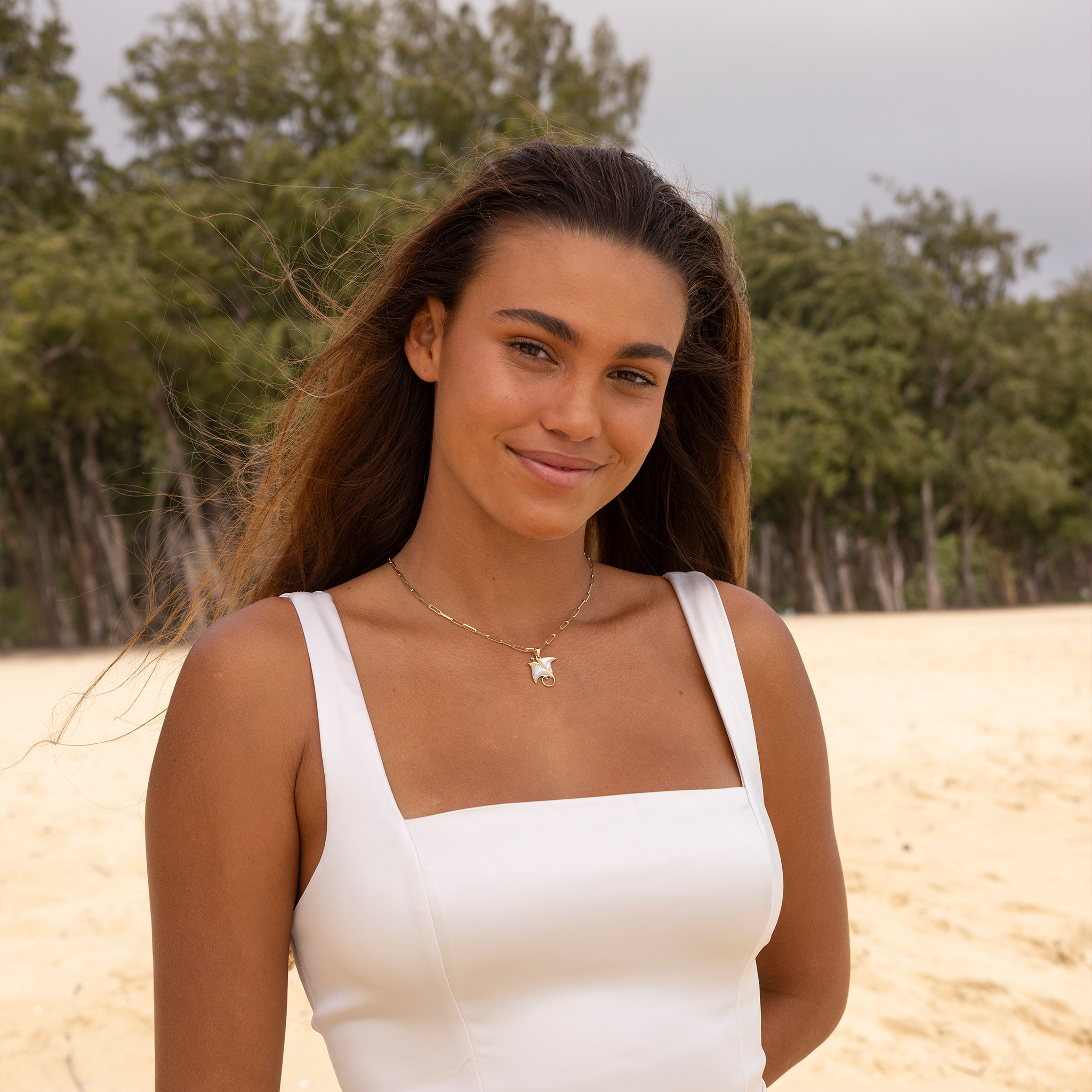 シーライフ・コレクションのマンタ・ペンダントは、輝くホワイト・マザー・オブ・パール、ダイヤモンド、ゴールドが特徴です。ハワイで作られたこのマンタ・ペンダントは、マウイ島旅行の記念に最適です。