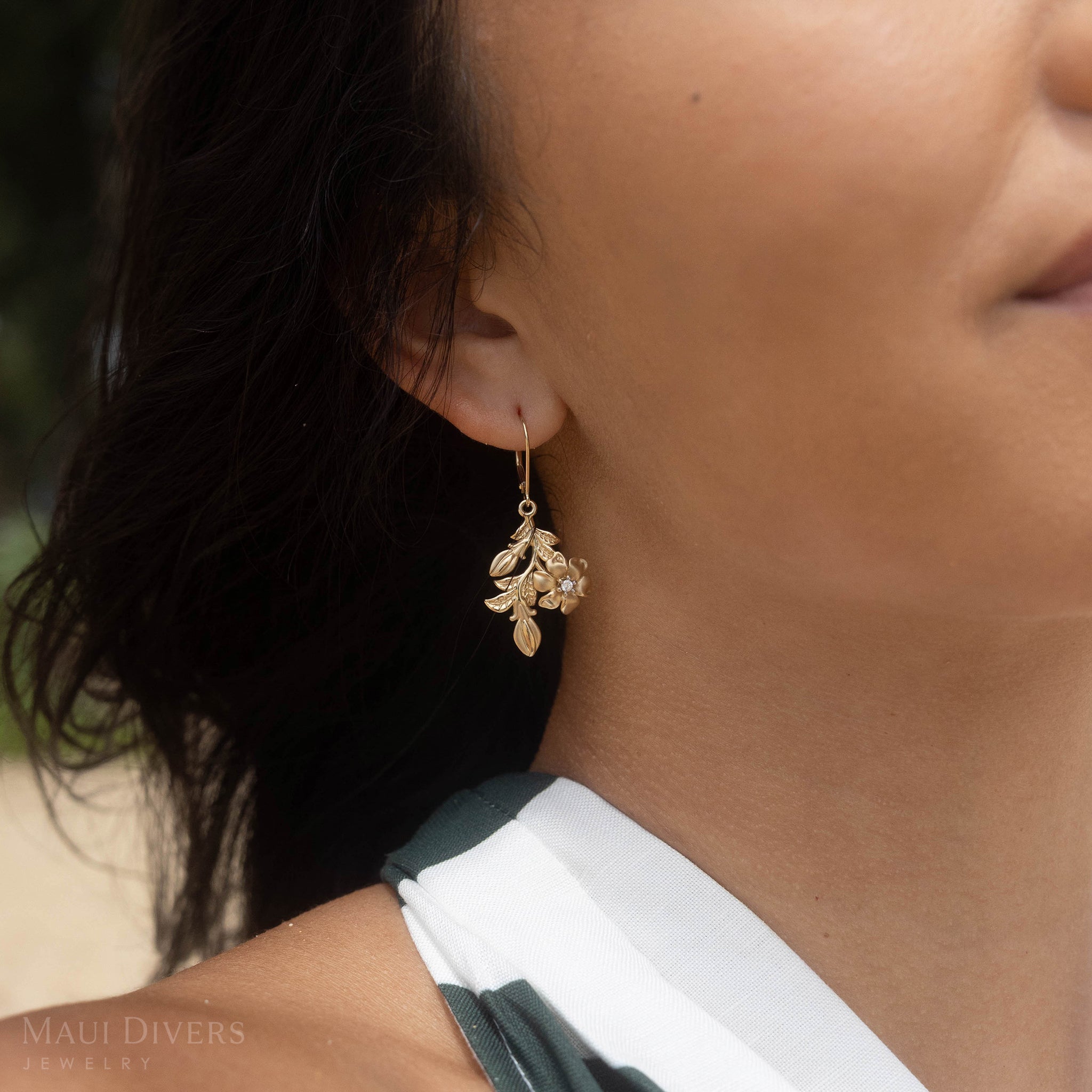 The Nāʻū Earrings are inspired by the charming Native Hawaiian Gardenia. They feature a unique combination of satin and high-polish finishes with sparkling natural diamonds. Just as the sweet fragrance of the Nāʻū brings a soft smile to your face, wear the Nāʻū to represent one bearing good news and the happiness that fills you.