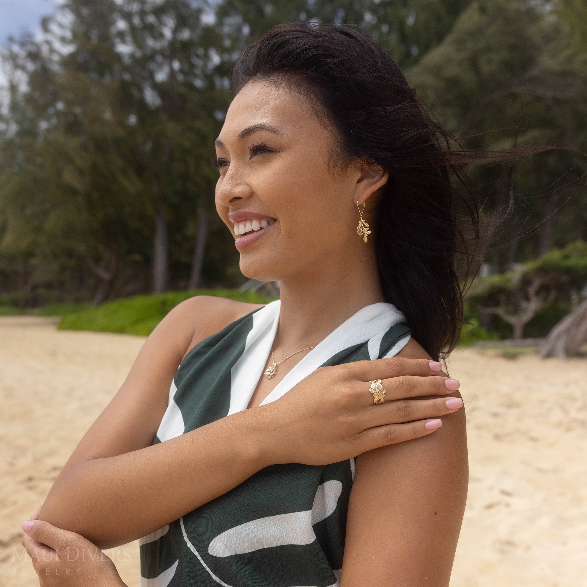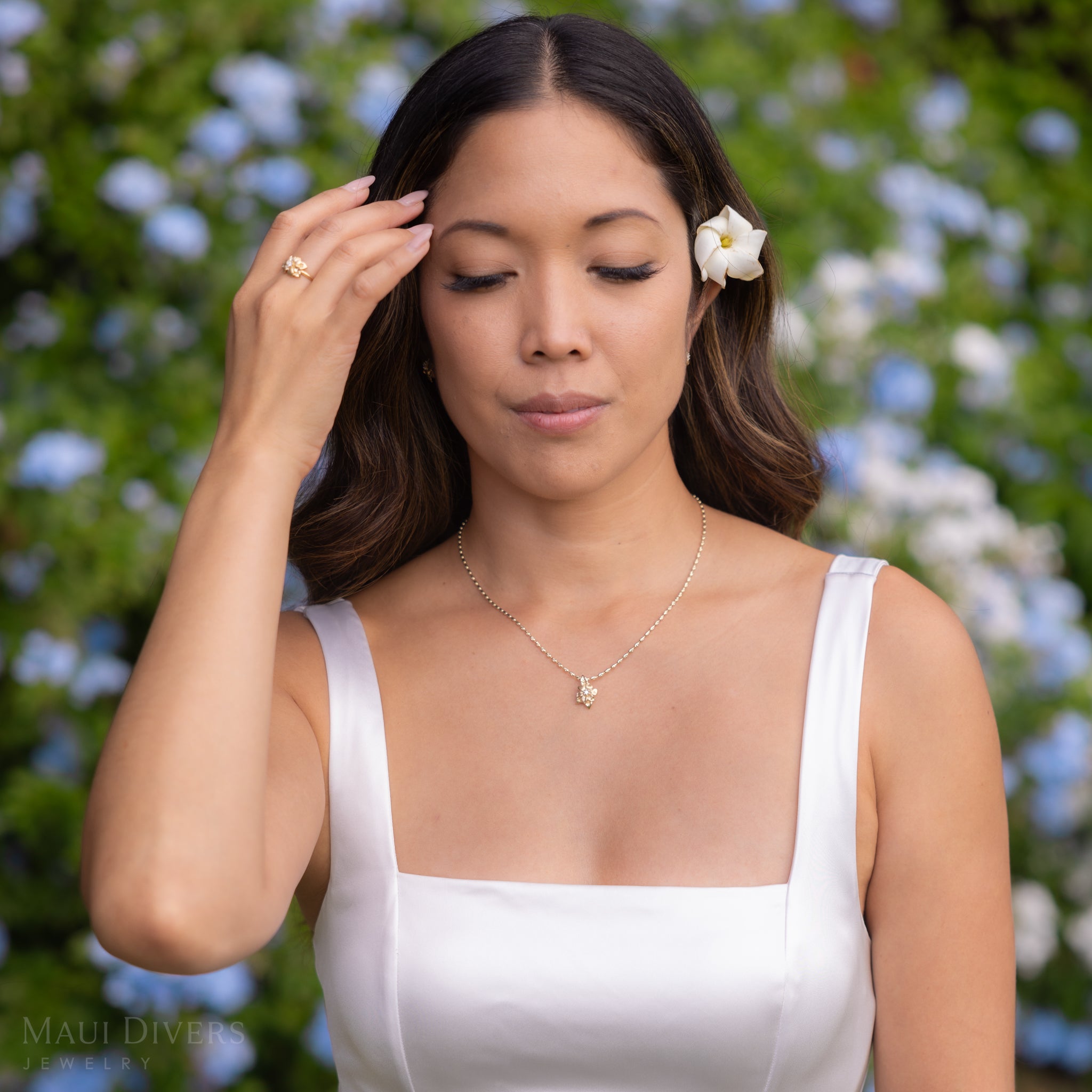The Nāʻū Pendant is inspired by the charming Native Hawaiian Gardenia. The pendant features delicate petals with a soft flow in glistening satin-finished gold. Leaves frame the flower and hide the bail just along the top to accentuate its organic design. Just as the sweet fragrance of the Nāʻū brings a soft smile to your face, wear the Nāʻū to represent one bearing good news and the happiness that fills you.