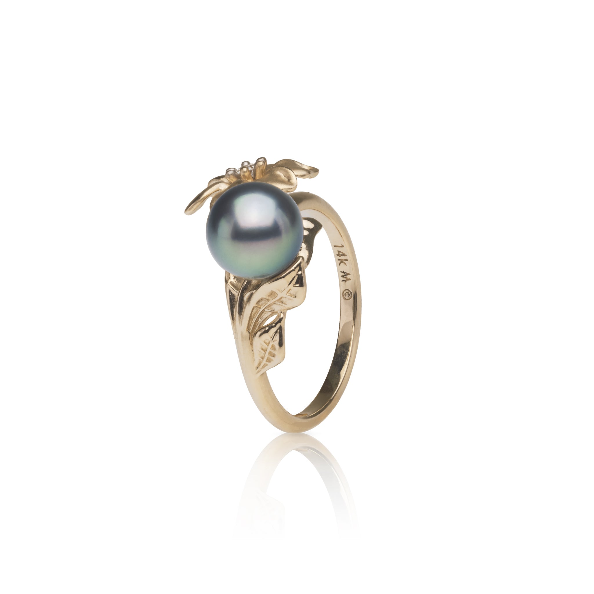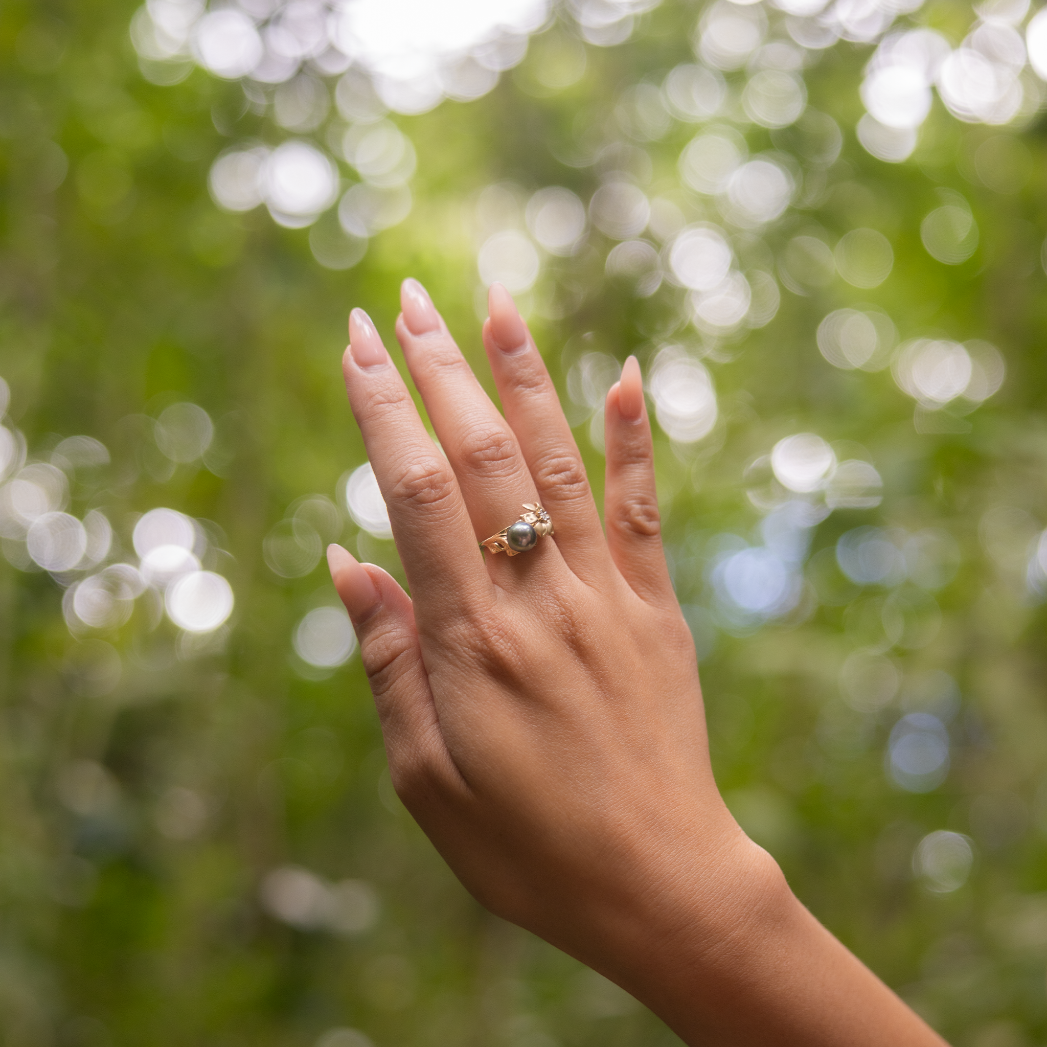 The Nāʻū Ring is inspired by the charming Native Hawaiian Gardenia. The ring features a lustrous Tahitian black pearl, shimmering satin-finished gardenia with diamond accent, high-polish leaves. Just as the sweet fragrance of the Nāʻū brings a soft smile to your face, wear the Nāʻū to represent one bearing good news and the happiness that fills you.