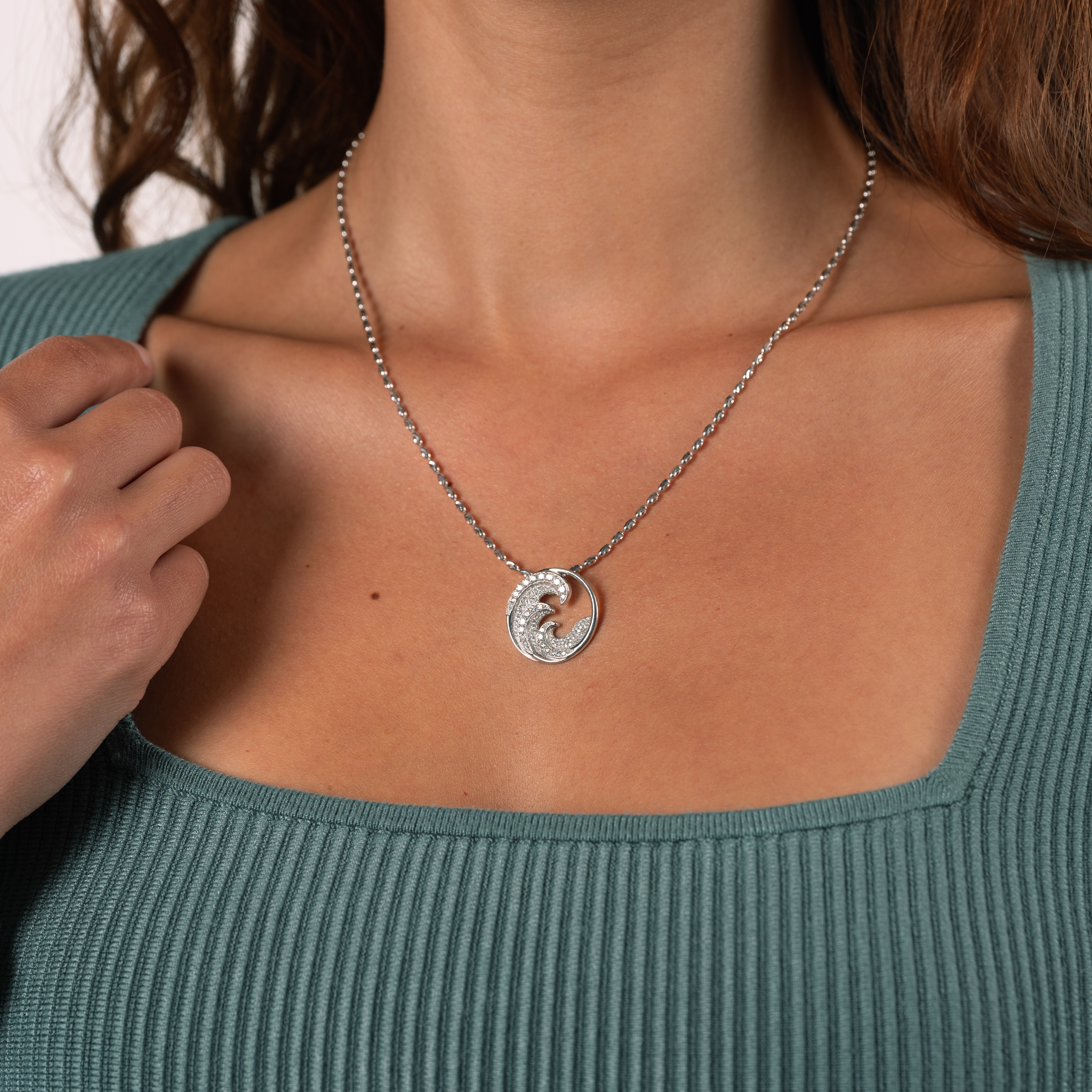 14Kホワイトゴールドとダイヤモンドのナル(波)ペンダントは、サテン仕上げのフレームに見事な波のデザインが施されています。さまざまな大きさの天然ダイヤモンドが輝くパヴェダイヤモンドの波を描き、過去、現在、未来を表現しています。