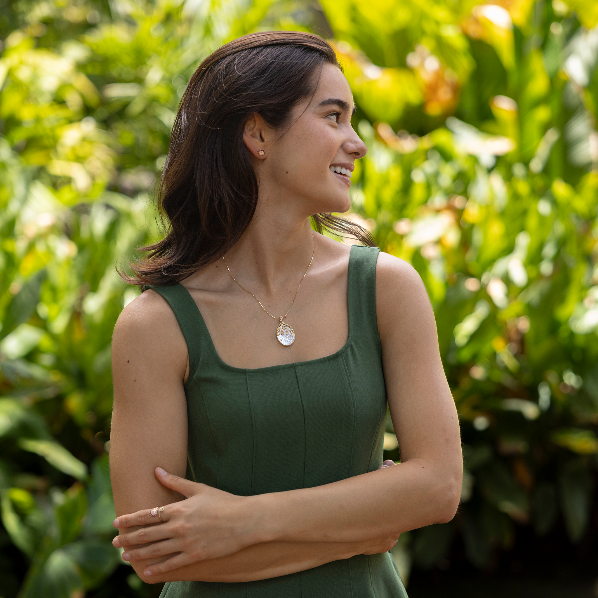 ʻŌhiʻa Lehua Waterfall Pendantは、卓越した芸術性が特徴です。虹色に輝くマザー・オブ・パールに刻まれた滝が、ʻʻŌhiʻa Lehuaの黄金色の葉と咲き誇る花々とともに、絵画のようなフレームを作り出しています。煌めくダイヤモンドをあしらった、息をのむような芸術品。