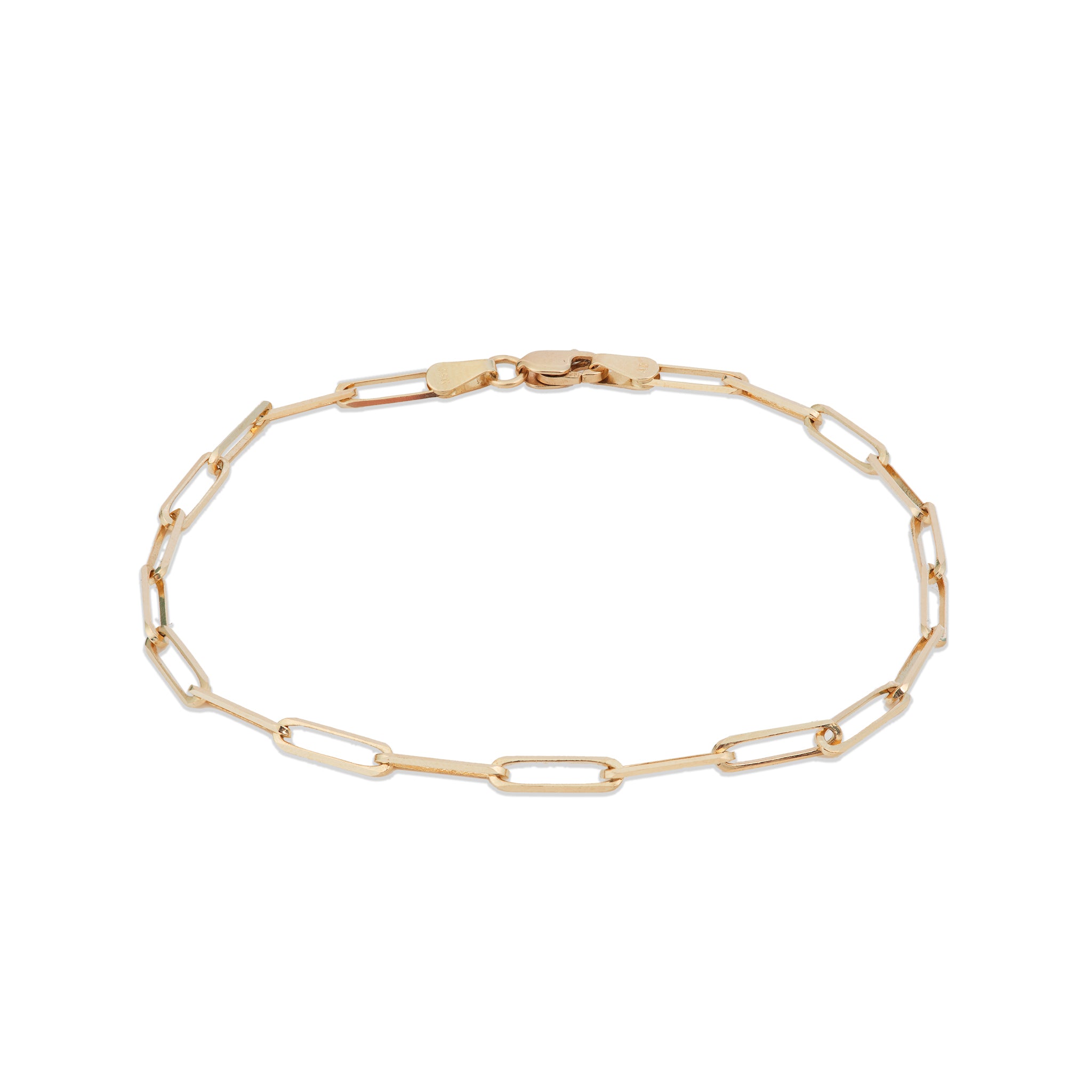 14Kイエローゴールドの2.7mmペーパークリップ・チェーン・ブレスレット。リンクデザインでサイズを簡単に調節でき、お気に入りのチャームをスライドさせてアクセサリーとしても楽しめます。