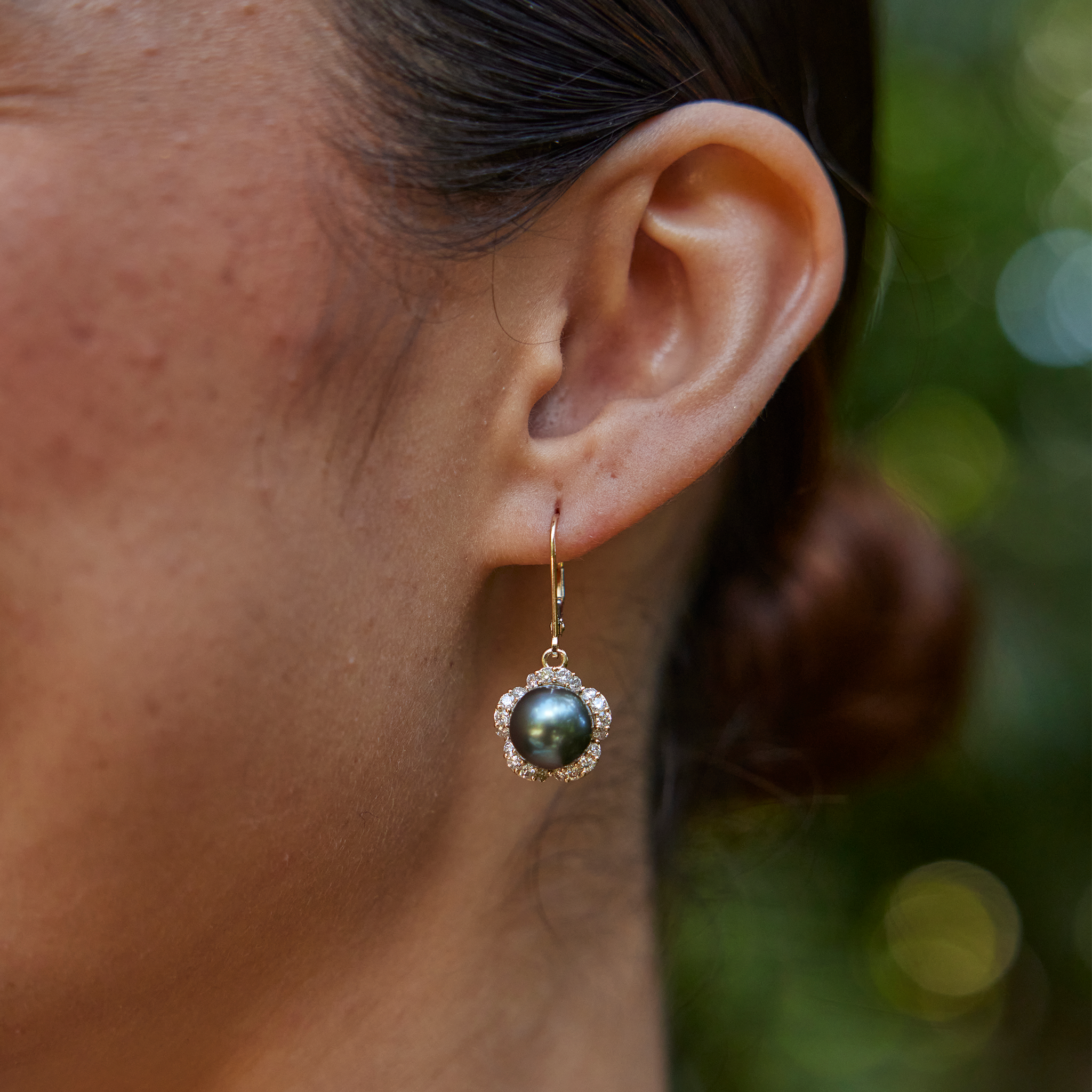 プルメリア ダイヤモンド ゴールド タヒチ黒真珠 ピアス - 9-10mm