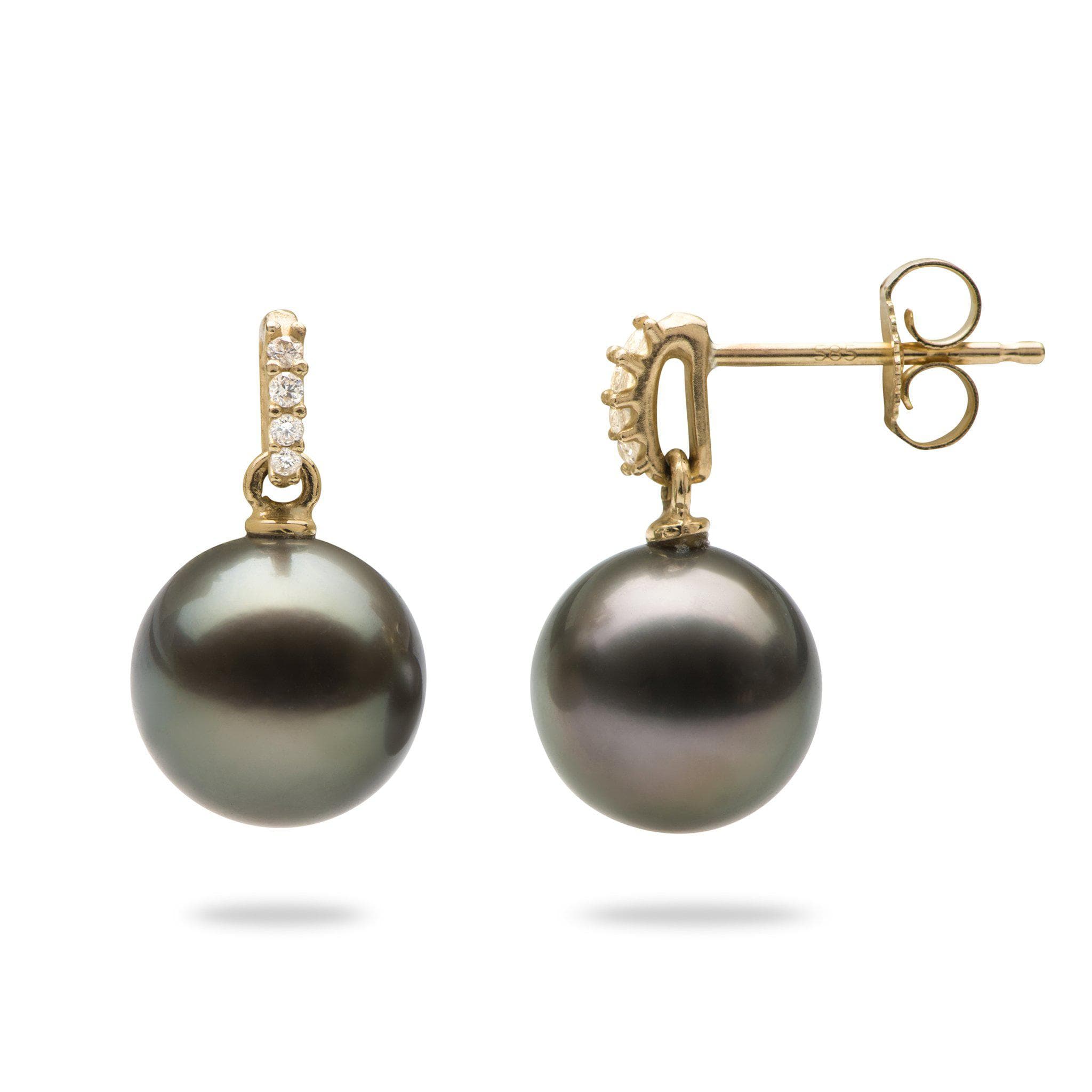 ダイヤモンドをあしらった14Kイエローゴールドのタヒチ黒真珠イヤリングは、シンプルでエレガントなドロップデザイン。