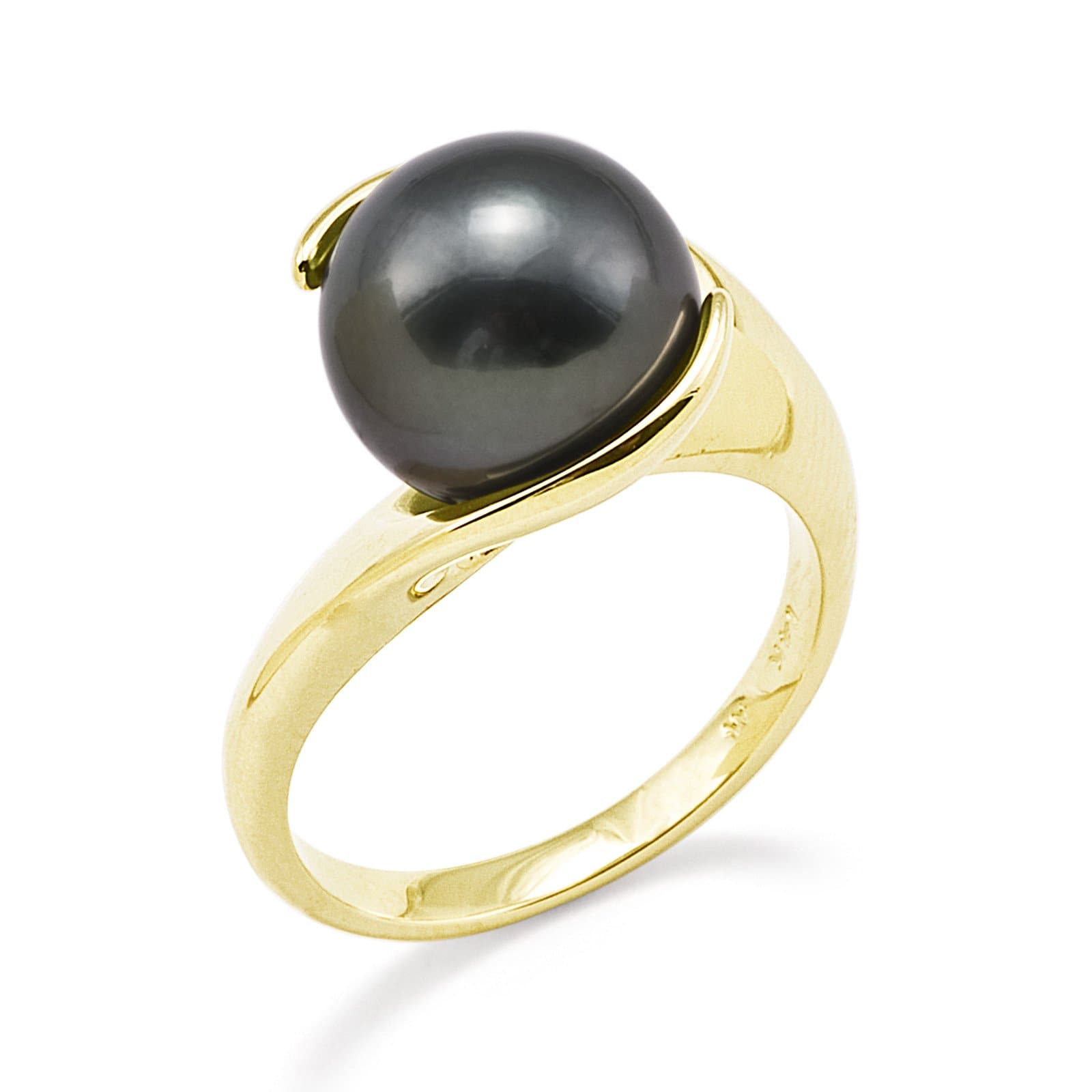 シンプルで大胆、そしてスタイリッシュな14Kイエローゴールドのタヒチアンブラックパールリングは、渦巻きのデザインが艶やかなタヒチアンブラックパールを美しく縁取ります。