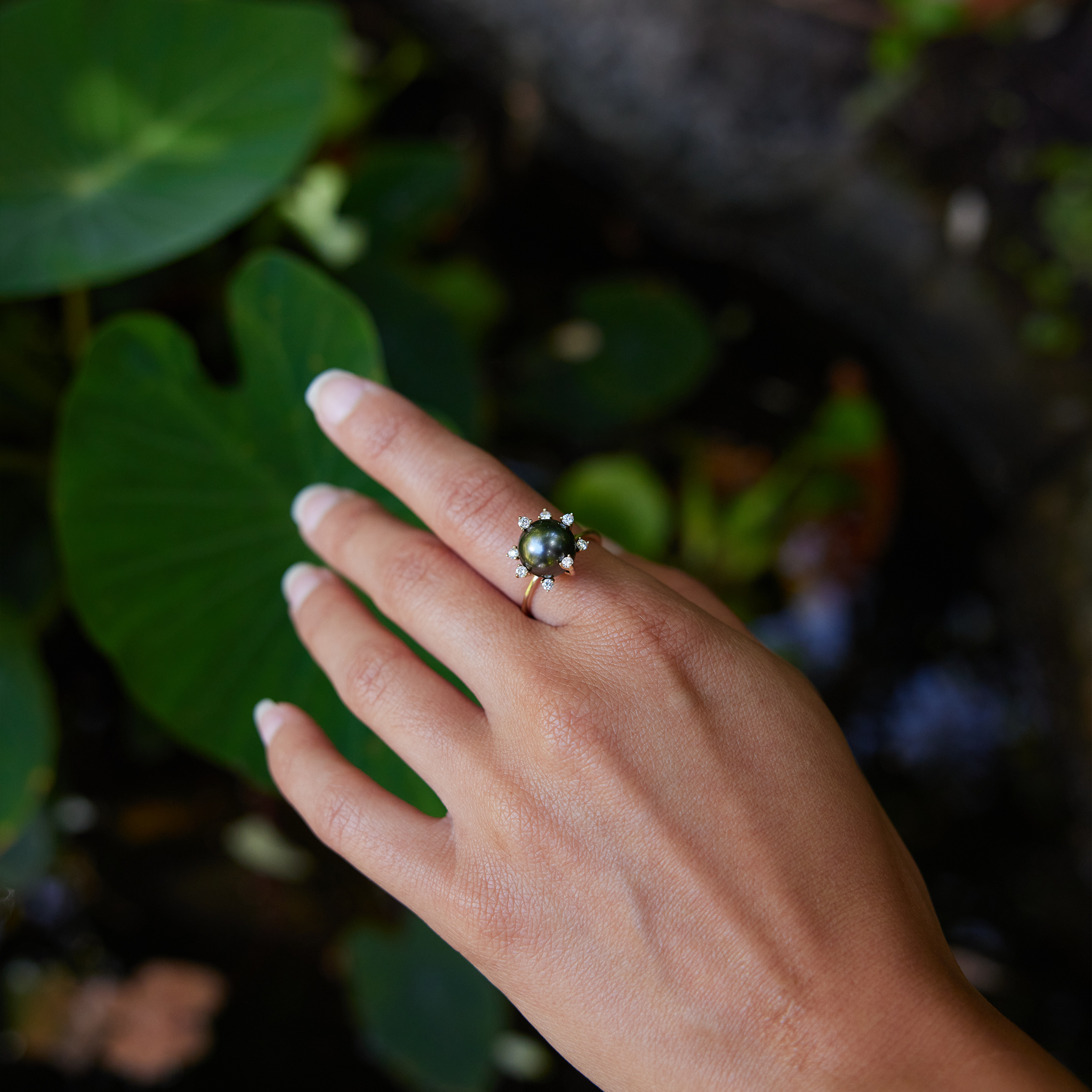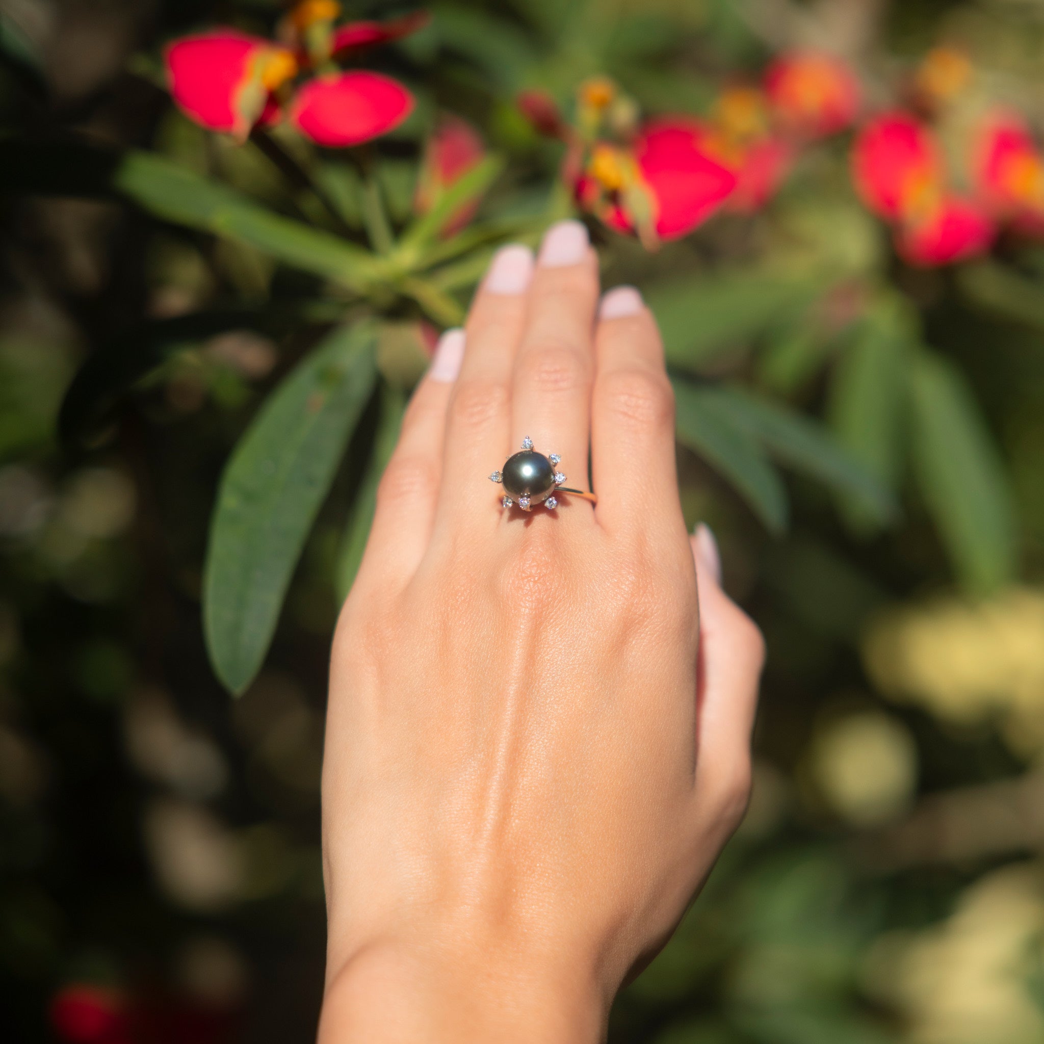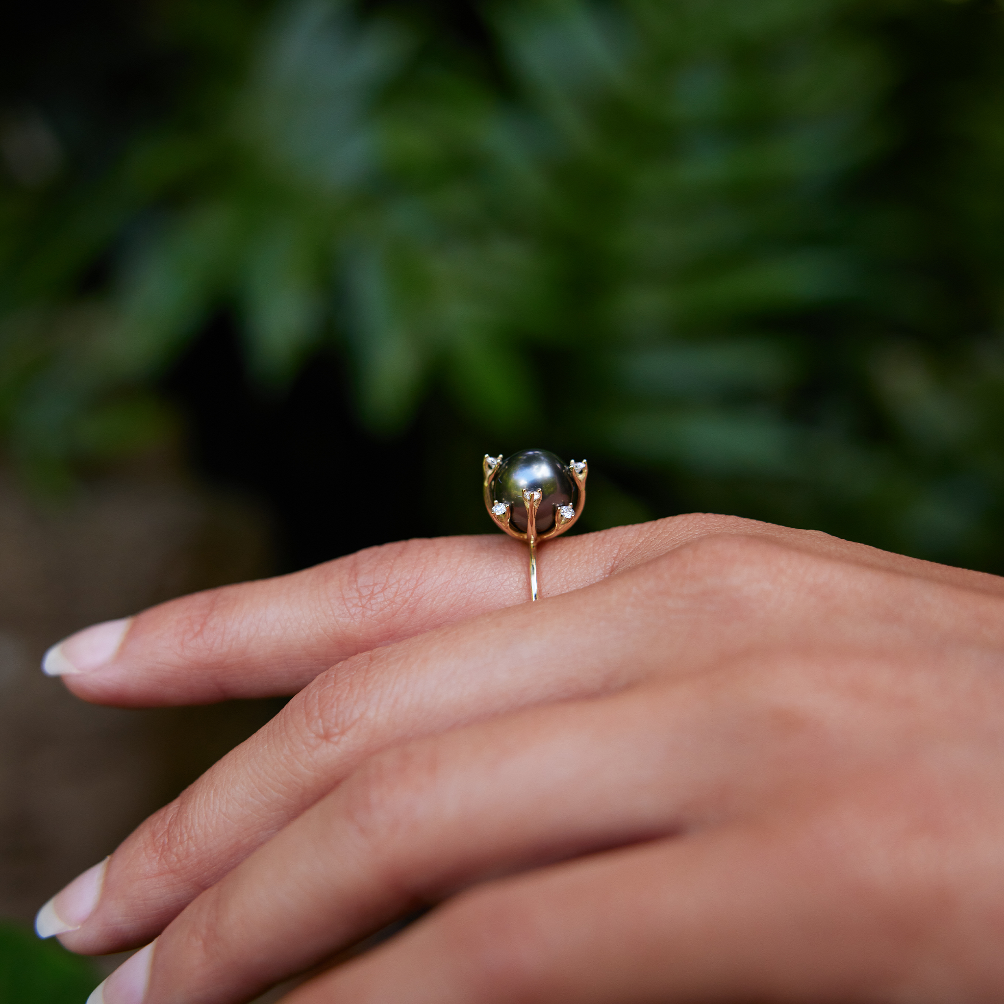 プロテア タヒチアン ブラック パール ダイヤモンド ゴールド リング - 10-11mm