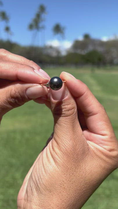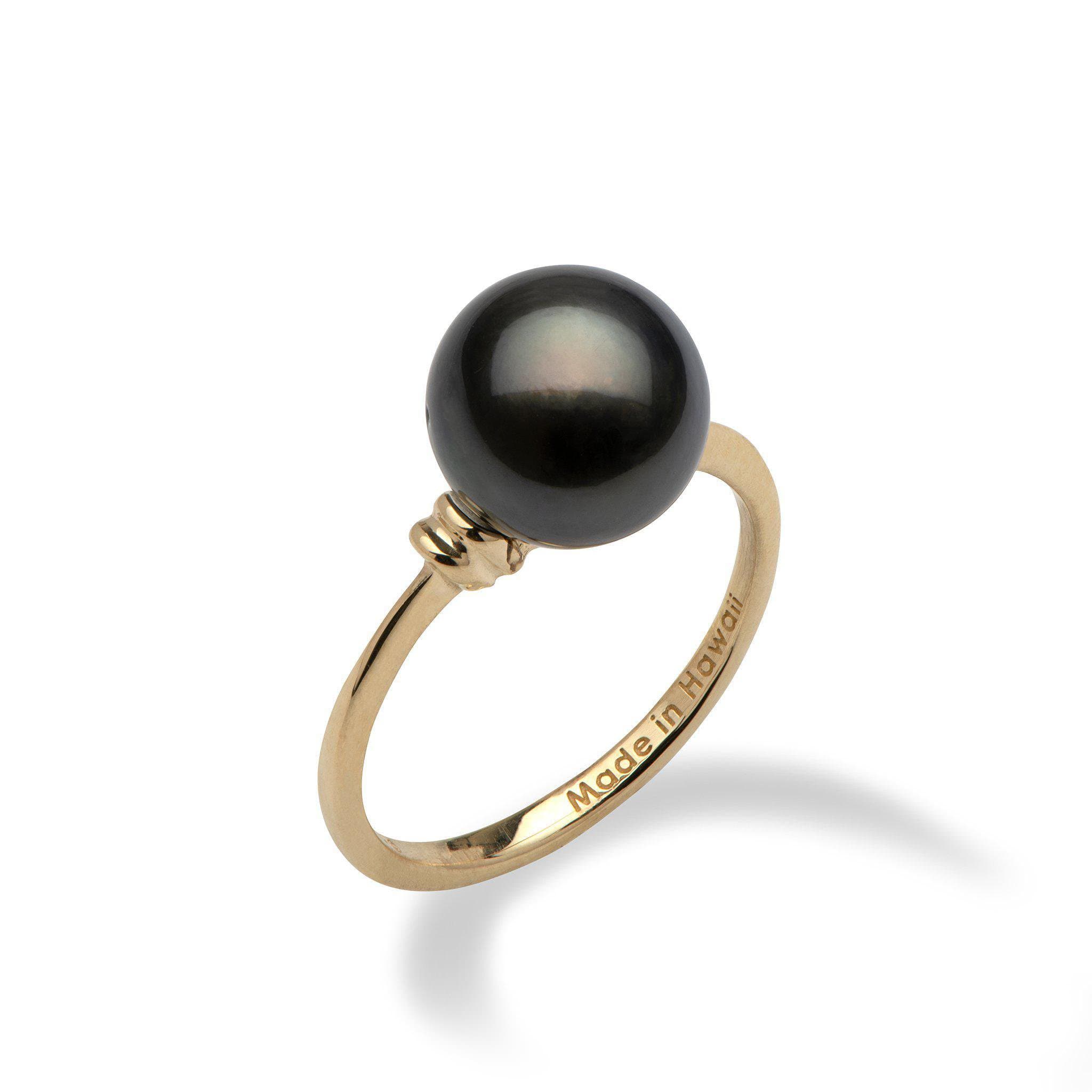 タヒチアンブラックパールのクラシックなリング。シンプルなゴールドのバンドは、クラウンの周りに小さなディテールをあしらい、美しいタヒチアンブラックパールを際立たせています。