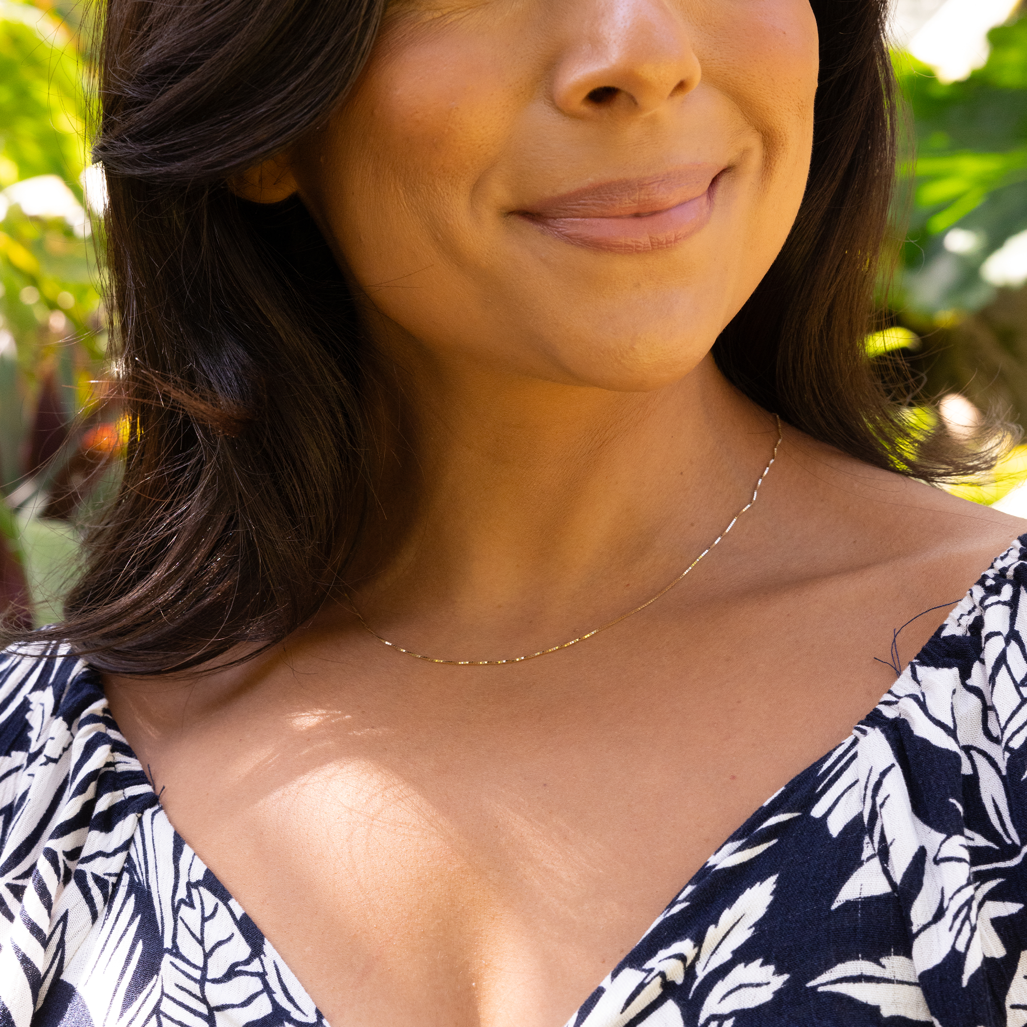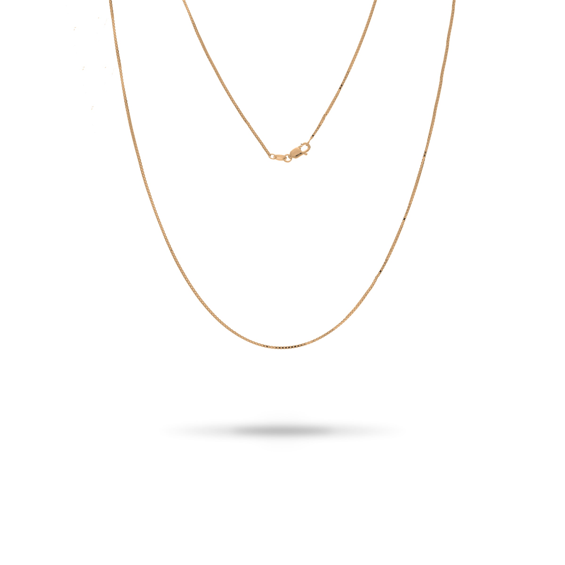 14Kイエローゴールドの0.8mmベネチアン・ボックス・チェーンは、シンプルで洗練されたスタイリッシュなボックス・デザイン。