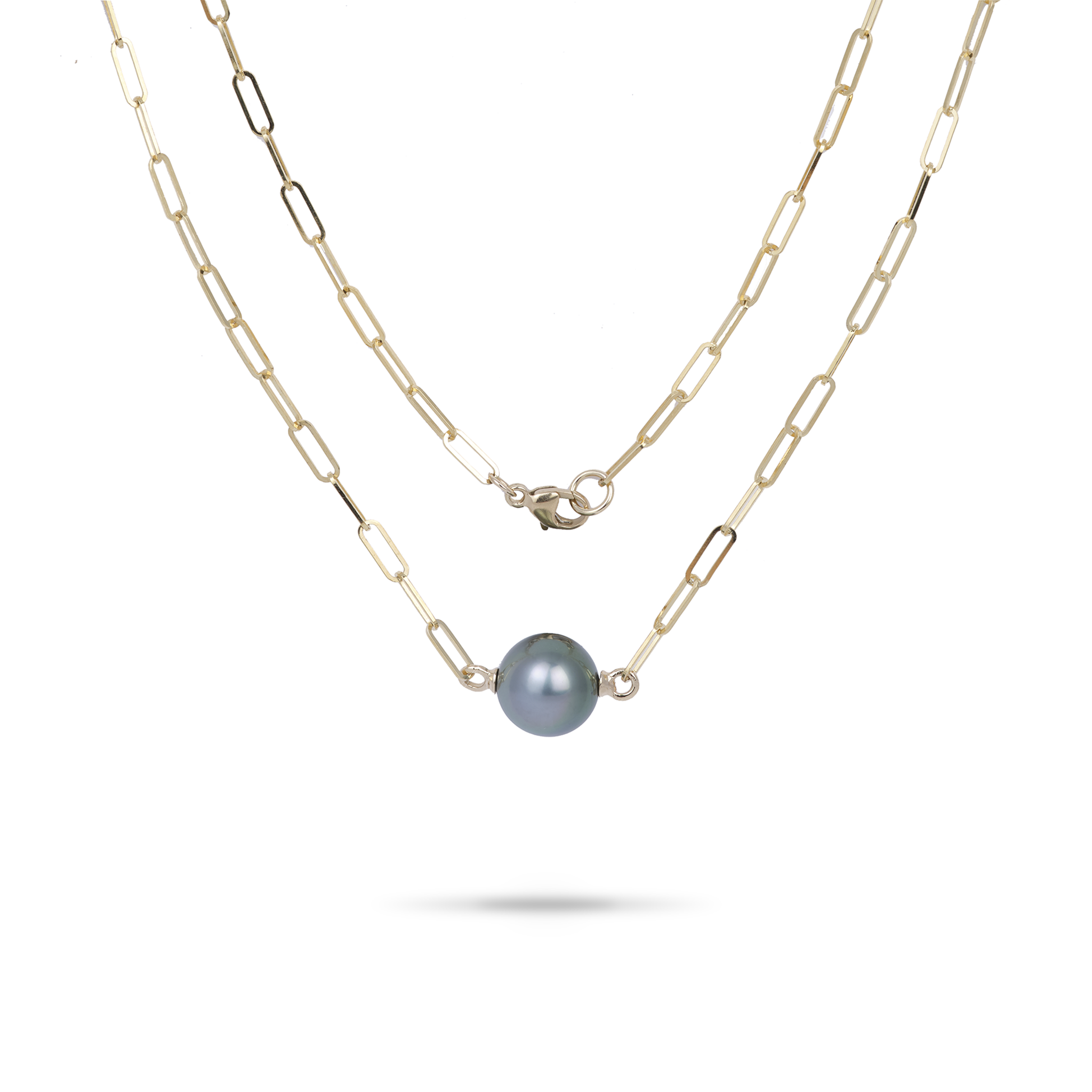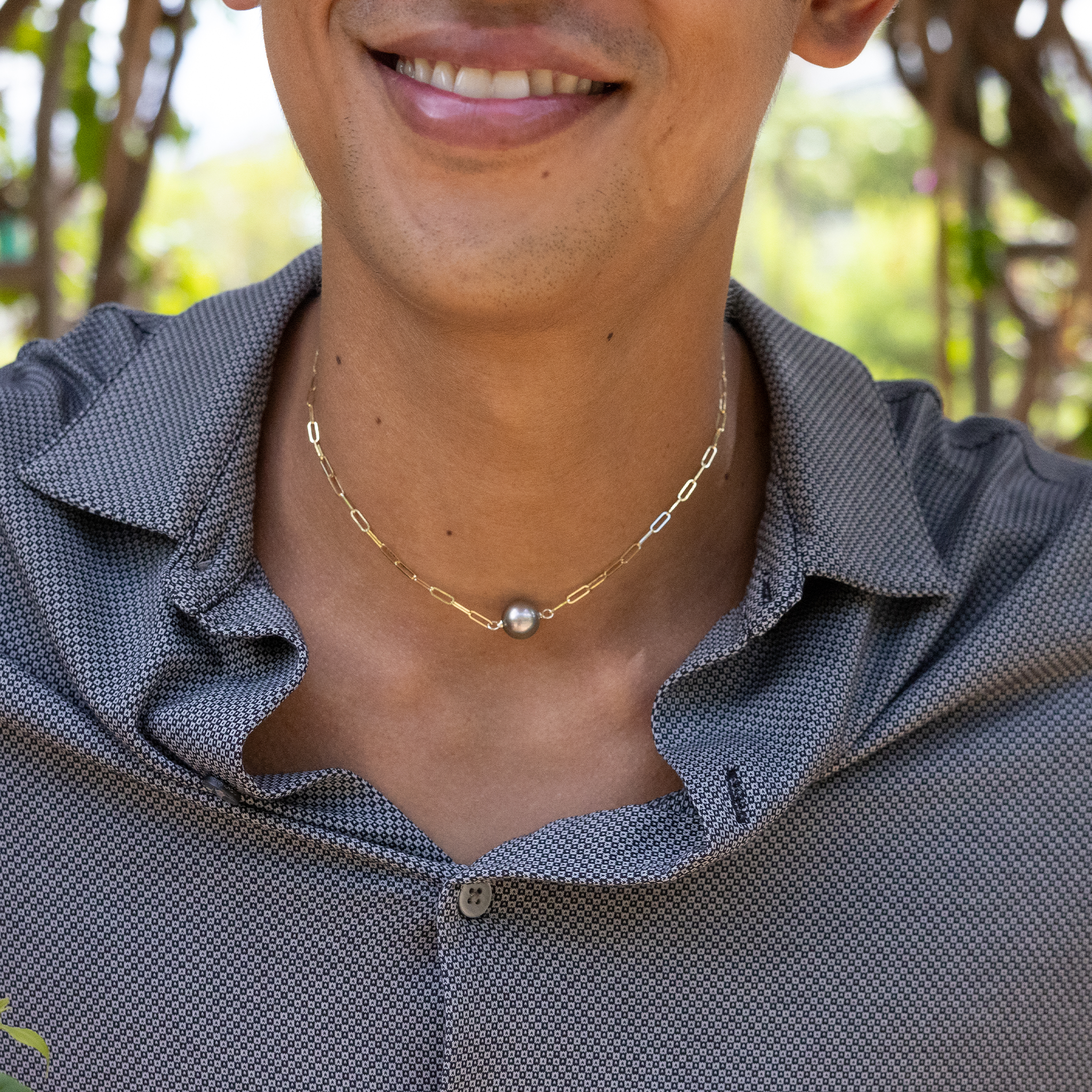 The choker-style necklace features a sleek Modern paperclip chain with a single Tahitian black pearl. It's a perfect necklace to layer with your other favorite chains and necklaces.