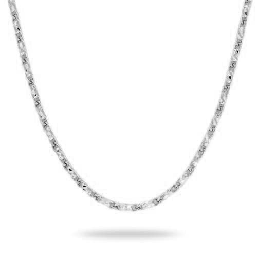 The 18" 1.4mm Raso Chain in 14k white gold features a sturdy oval link design that's tightly braided, creating a durable and stylish shimmering design.