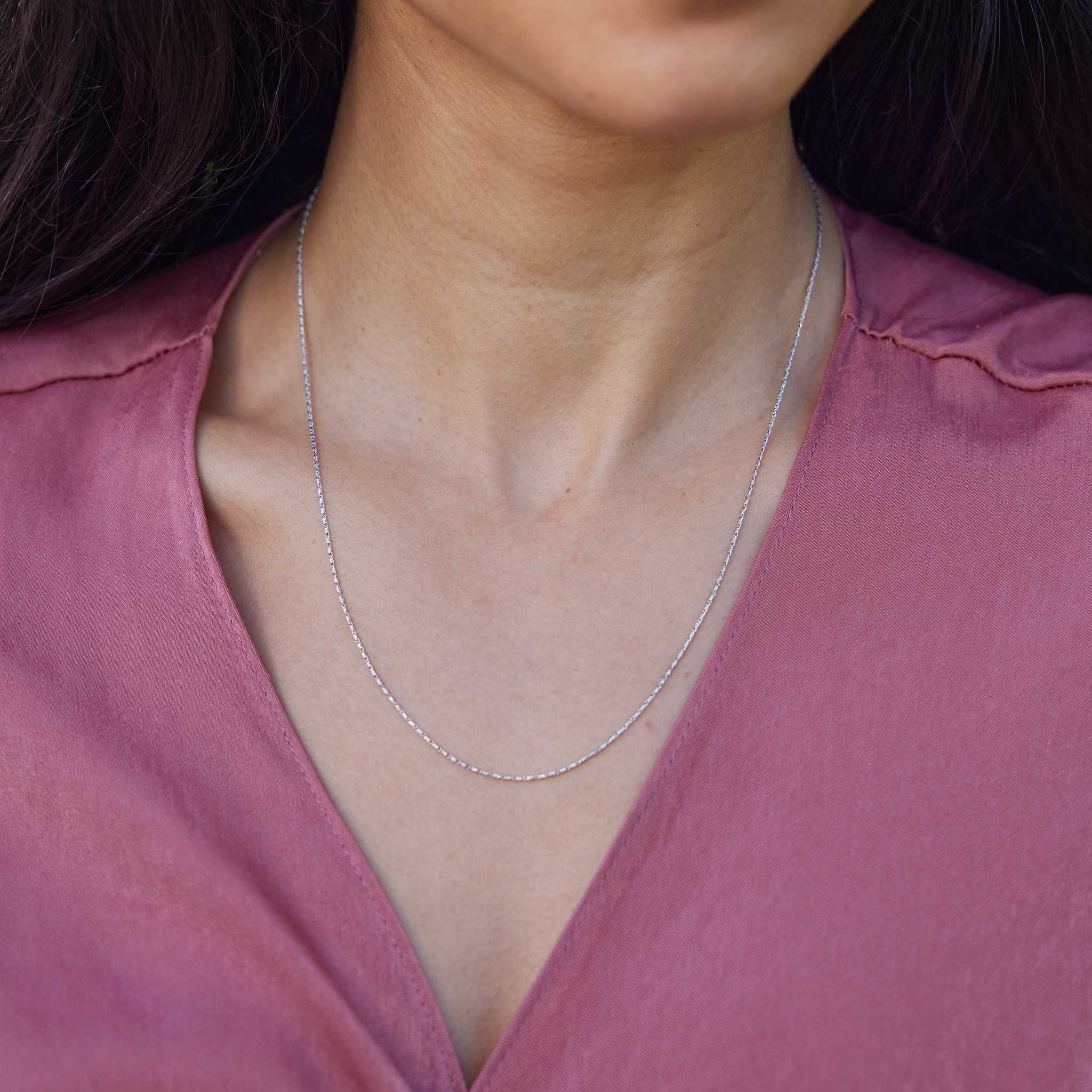 The 0.9mm Raso Chain in 14k white gold features a sturdy, oval-link design that's tightly braided, creating a durable and stylish shimmering effect. Plus, you can easily shorten or lengthen it up to 24 inches.