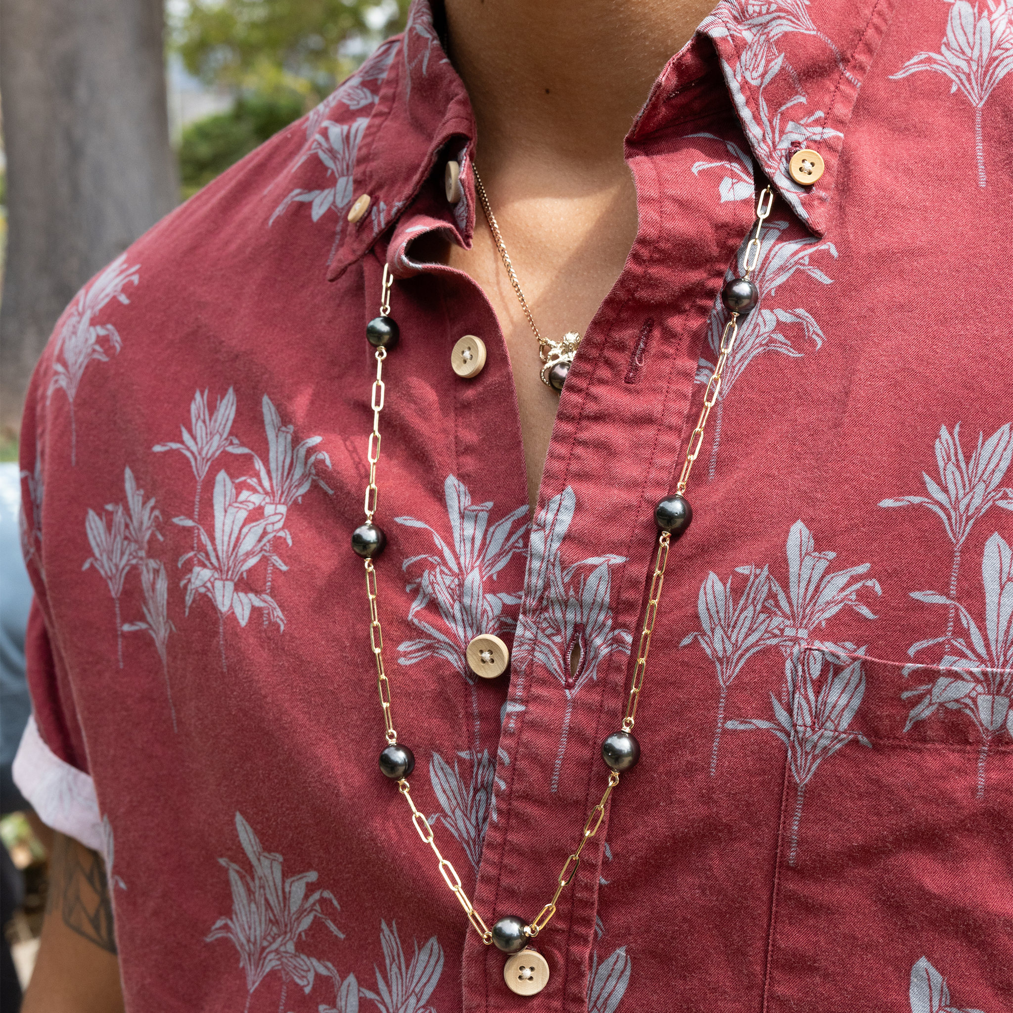 The Tahitian Black Pearl Paperclip Chain Necklace is a stunning new way to wear pearls. Measuring 34-35 inches in length, this unique pearl necklace brings stylish sophistication to all your favorite looks.