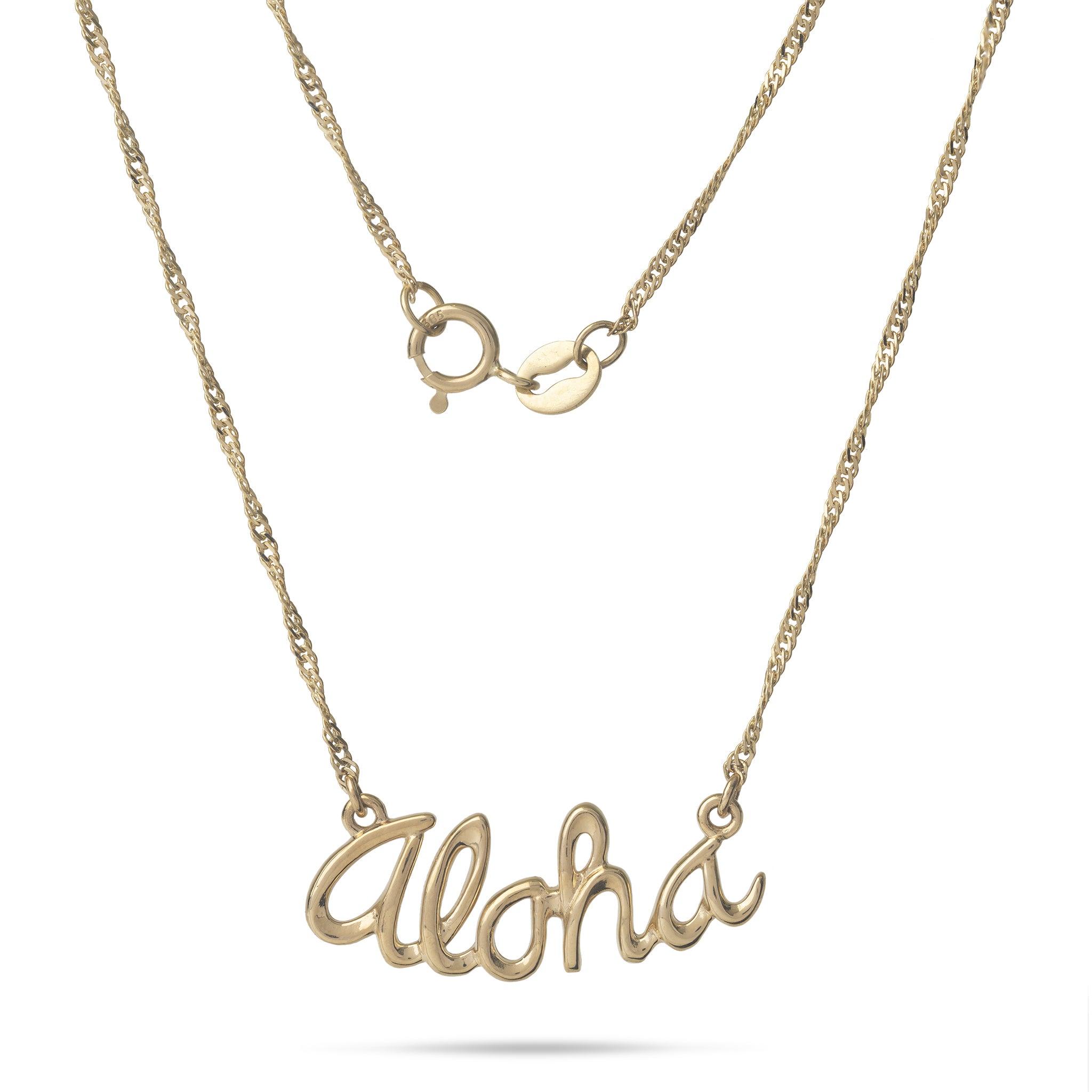 The 16" Aloha Necklace in 14k Yellow Gold elegantly displays the word "Aloha" in a graceful script. Paired with a shimmering Singapore chain, this necklace is a meaningful keepsake that keeps Hawaiʻi close to your heart.