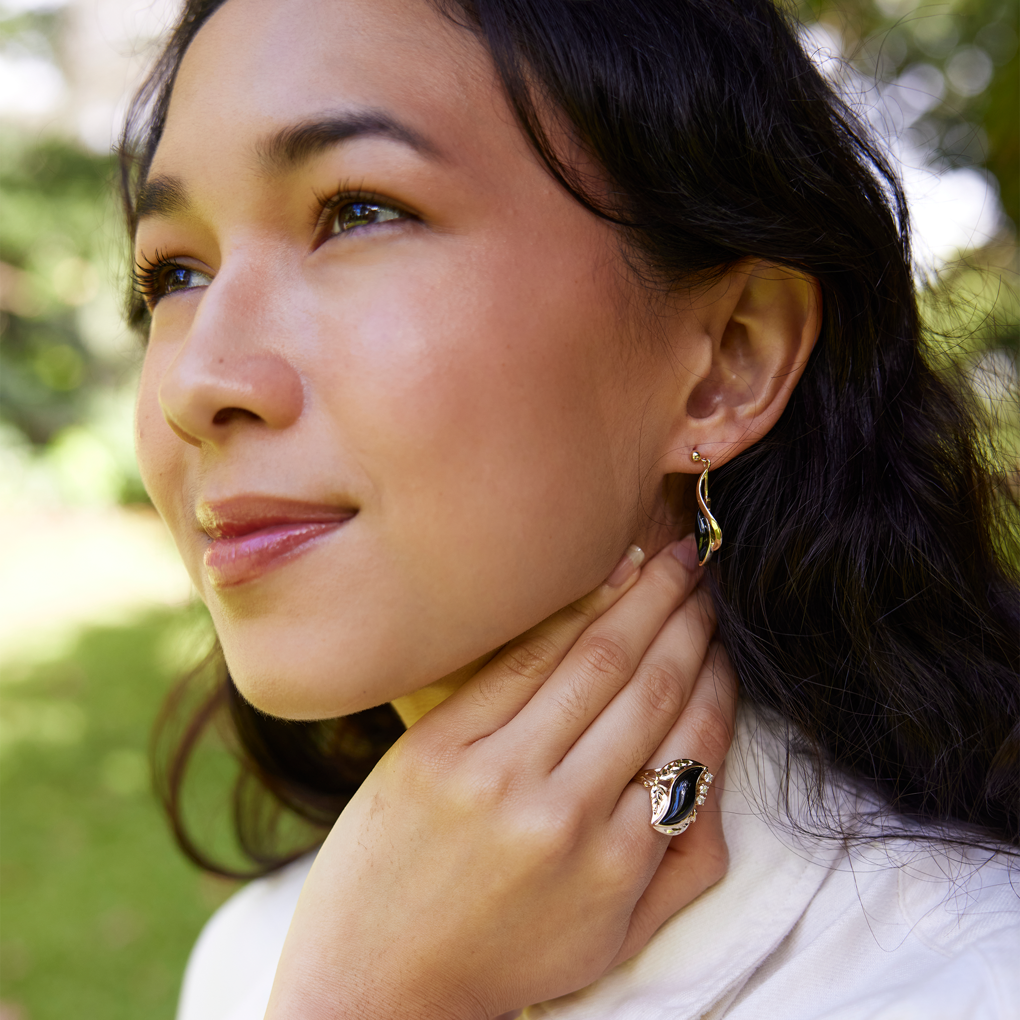 The Paradise Earrings in solid 14k gold feature a dramatic dangling design with lustrous Hawaiian black coral inlay contrasting classic high-polish yellow gold.