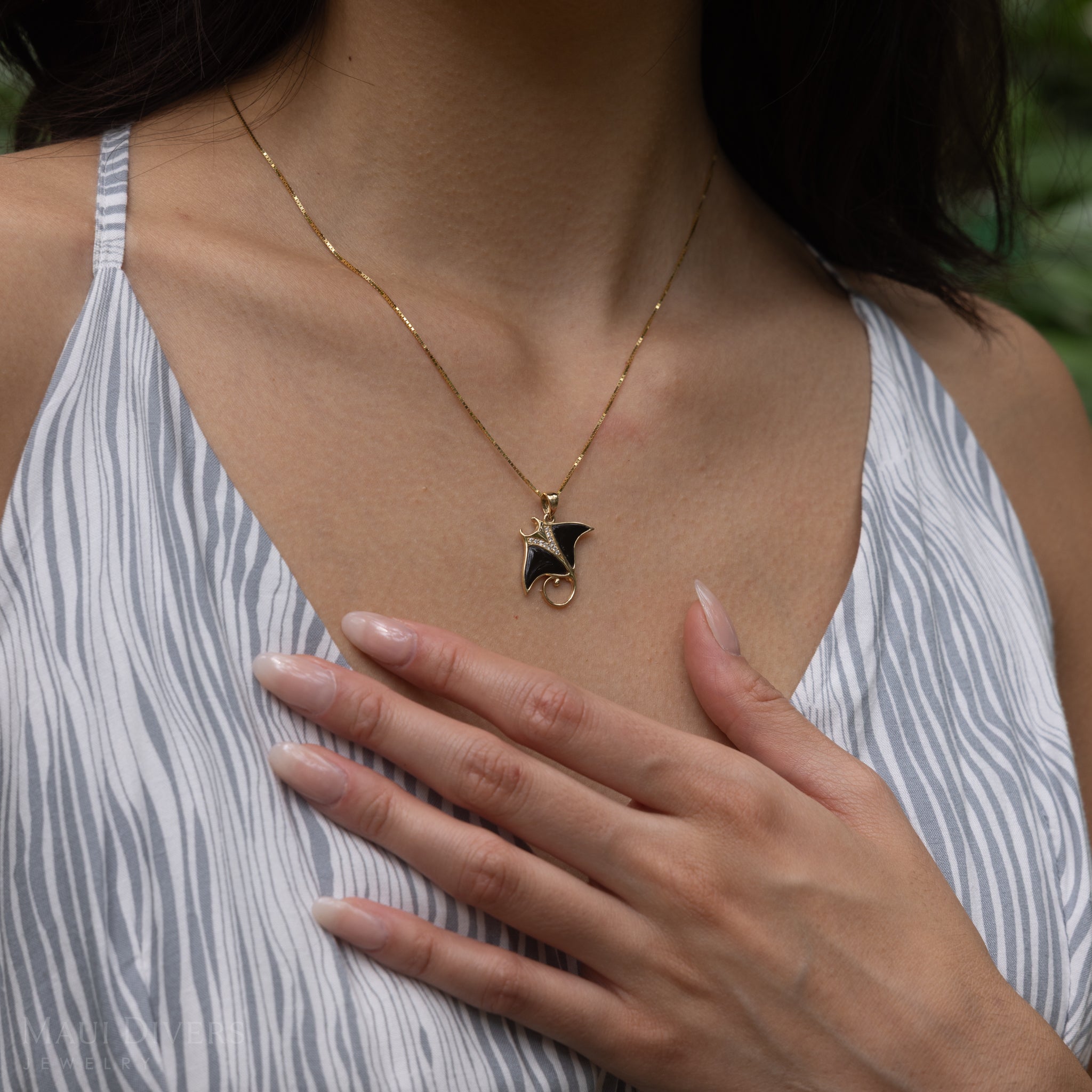 The Manta Ray Pendant from our Sealife Collection features the stunningly lustrous Hawaiʻi state gem, black coral, diamond, and gold. Locally made in Hawaiʻi, this Manta Ray Pendant is a perfect way to commemorate your trip to Maui.