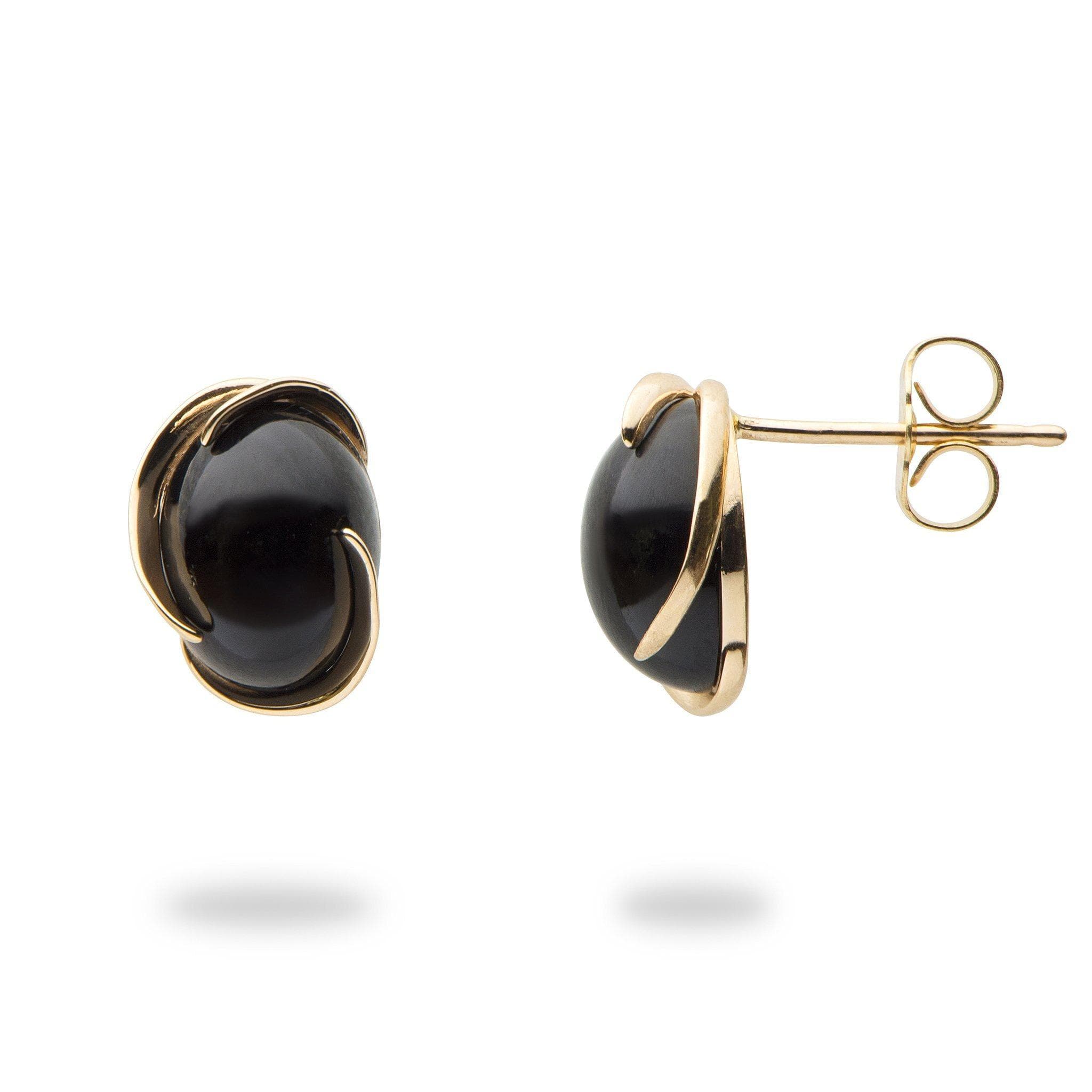 The Midnight Wave Earrings in 14k yellow gold feature lustrous Hawaiian black coral cabochons. The 14k yellow gold curves over the black coral, symbolizing the gorgeous waves of Hawaiʻi at night.