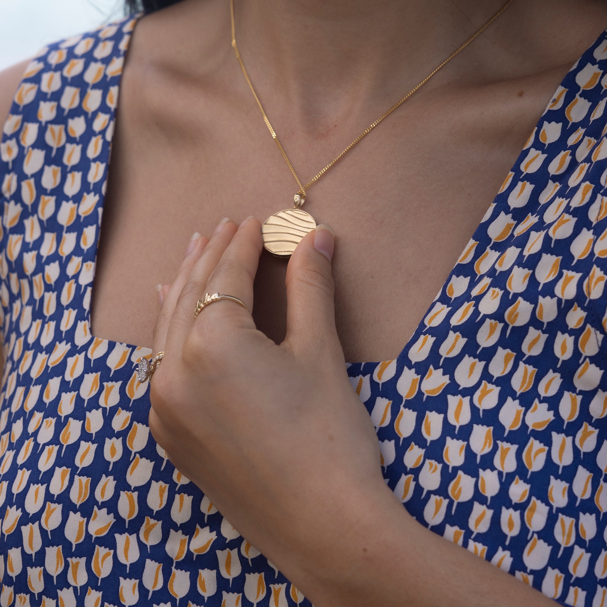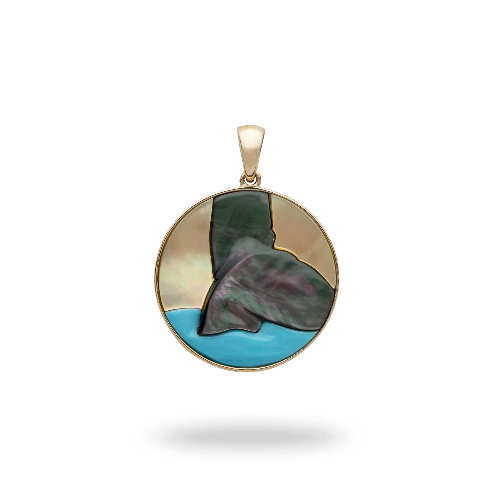 The Whale Tail Pendant reflects exquisite craftsmanship through its sculpted inlay. It features a stunning scene painted in blue turquoise, representing vibrant waters. The warm sunset is created with South Sea golden mother-of-pearl, contrasting beautifully with the whale tail crafted from Tahitian black mother-of-pearl.
