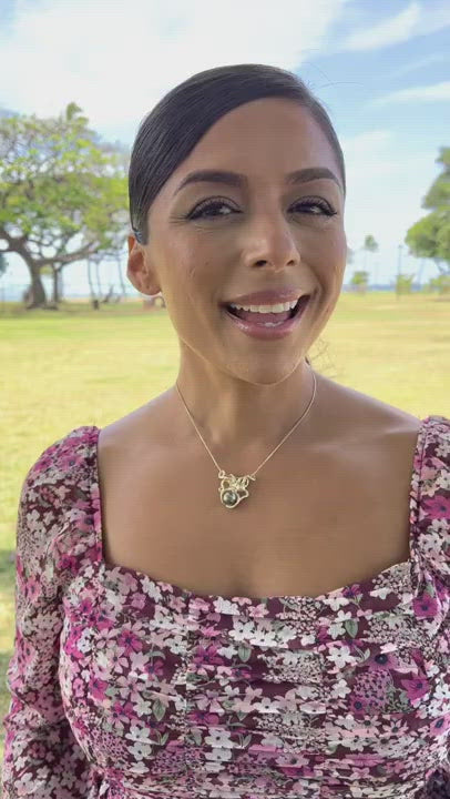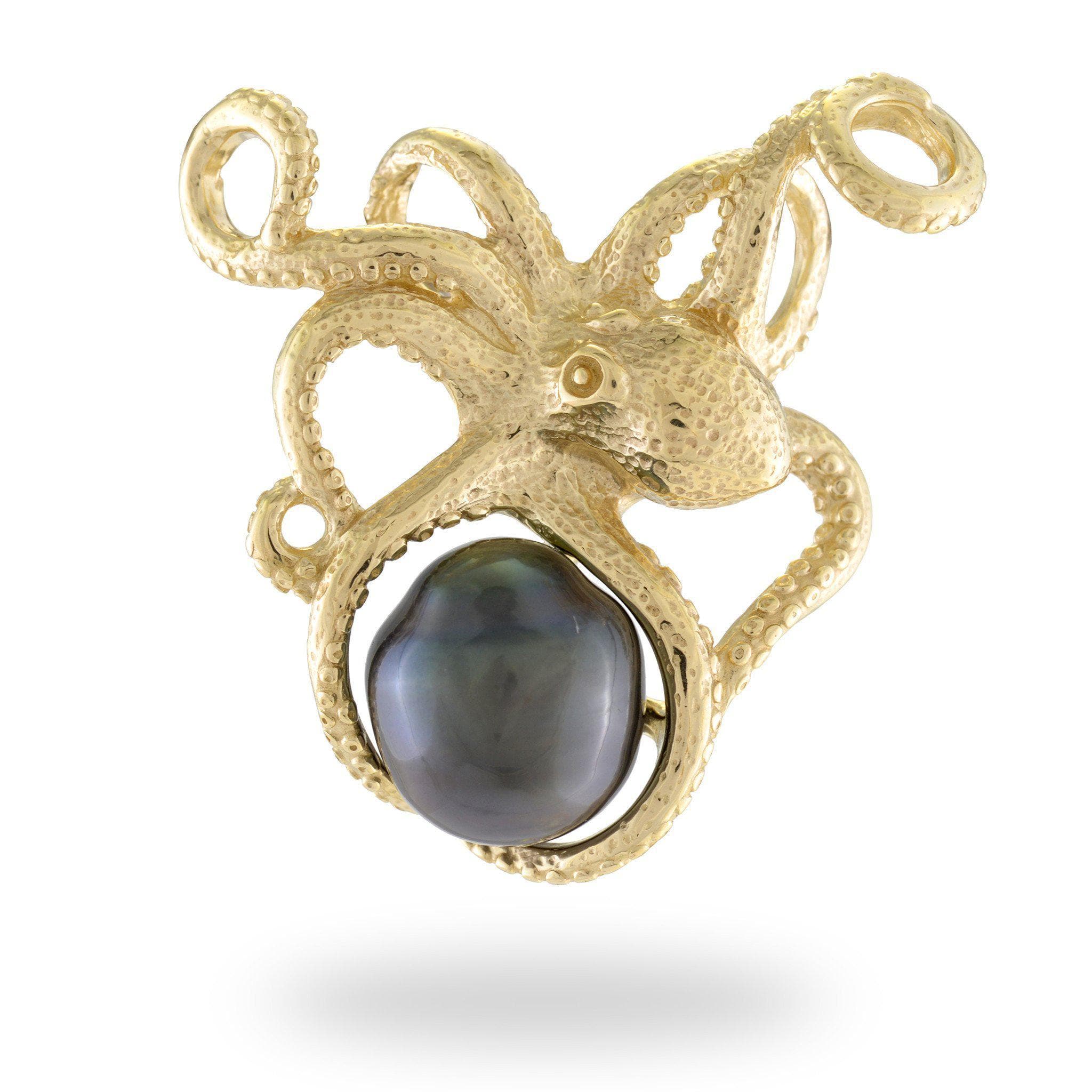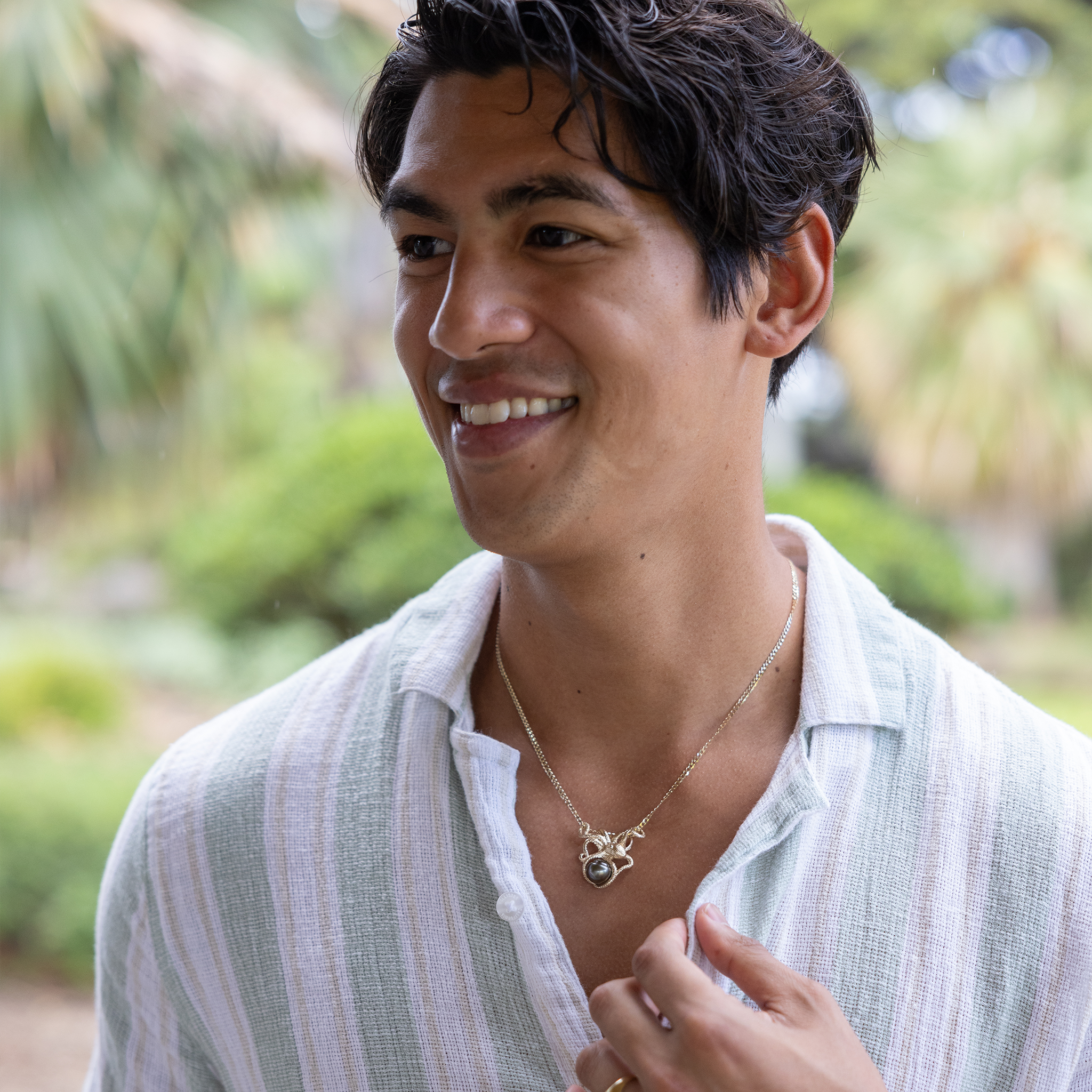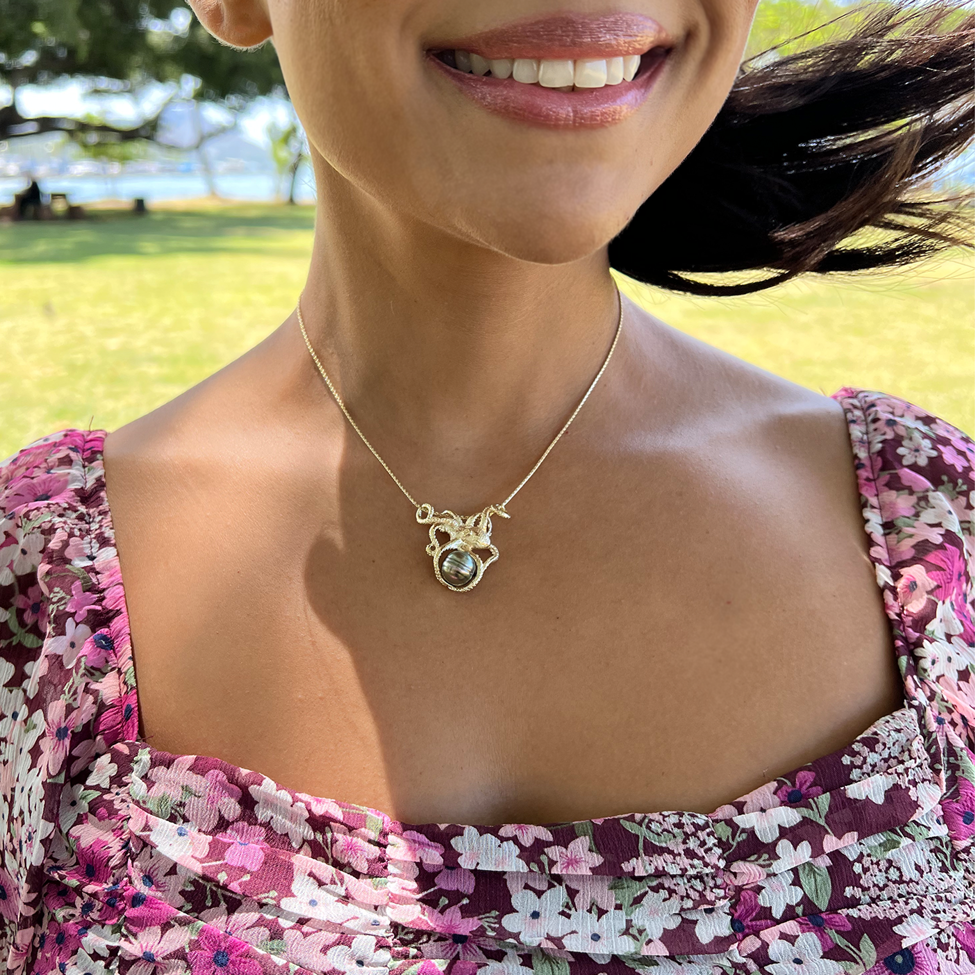 The Heʻe (Octopus) Pendant in 14k yellow gold features a distinguished Tahitian black pearl wrapped by octopus tentacles. A chain can cleverly slip through the tentacles, doubling as a fun and unique bail.