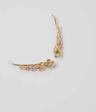 Plumeria Climber Earrings in Tri Color Gold with Diamonds - 19mm