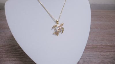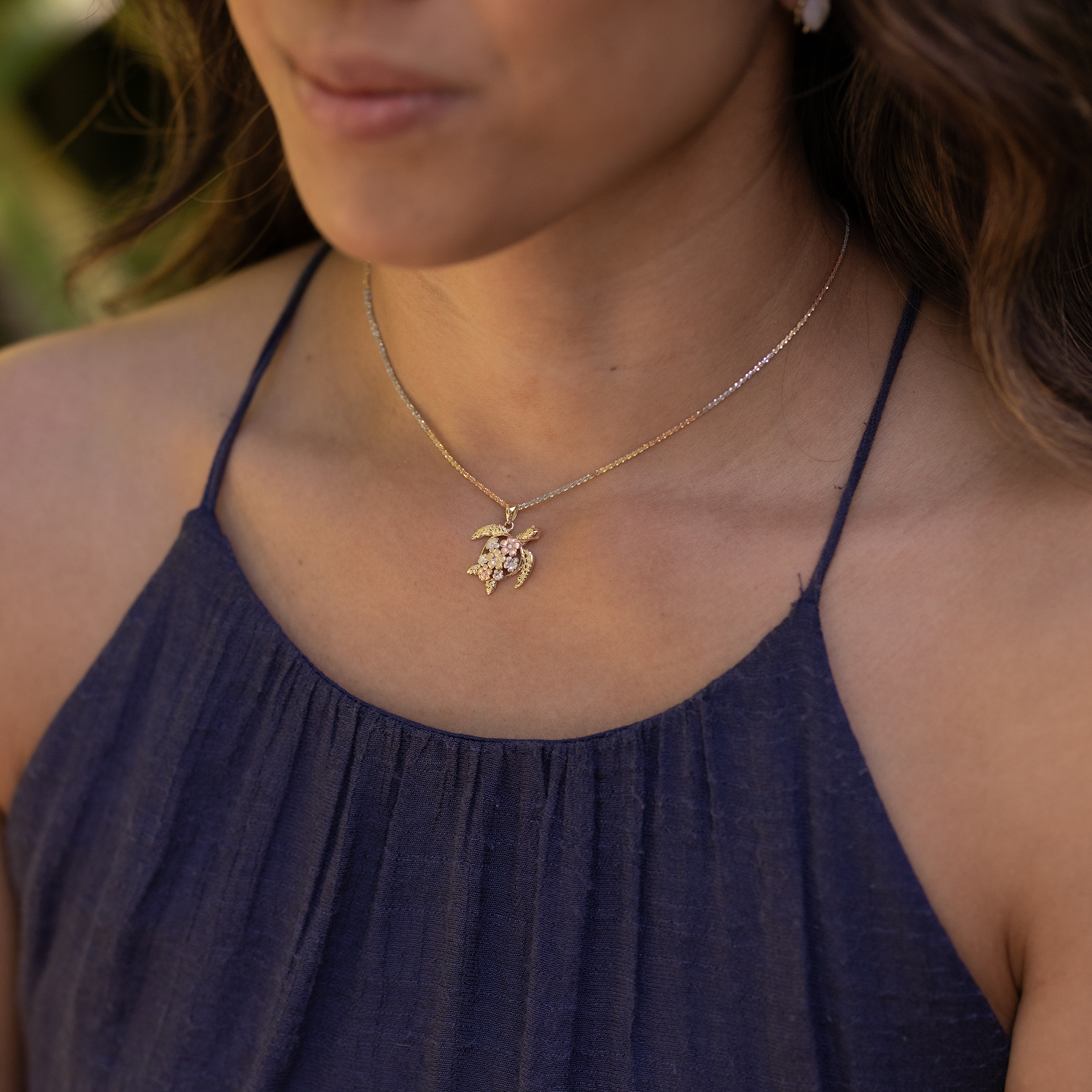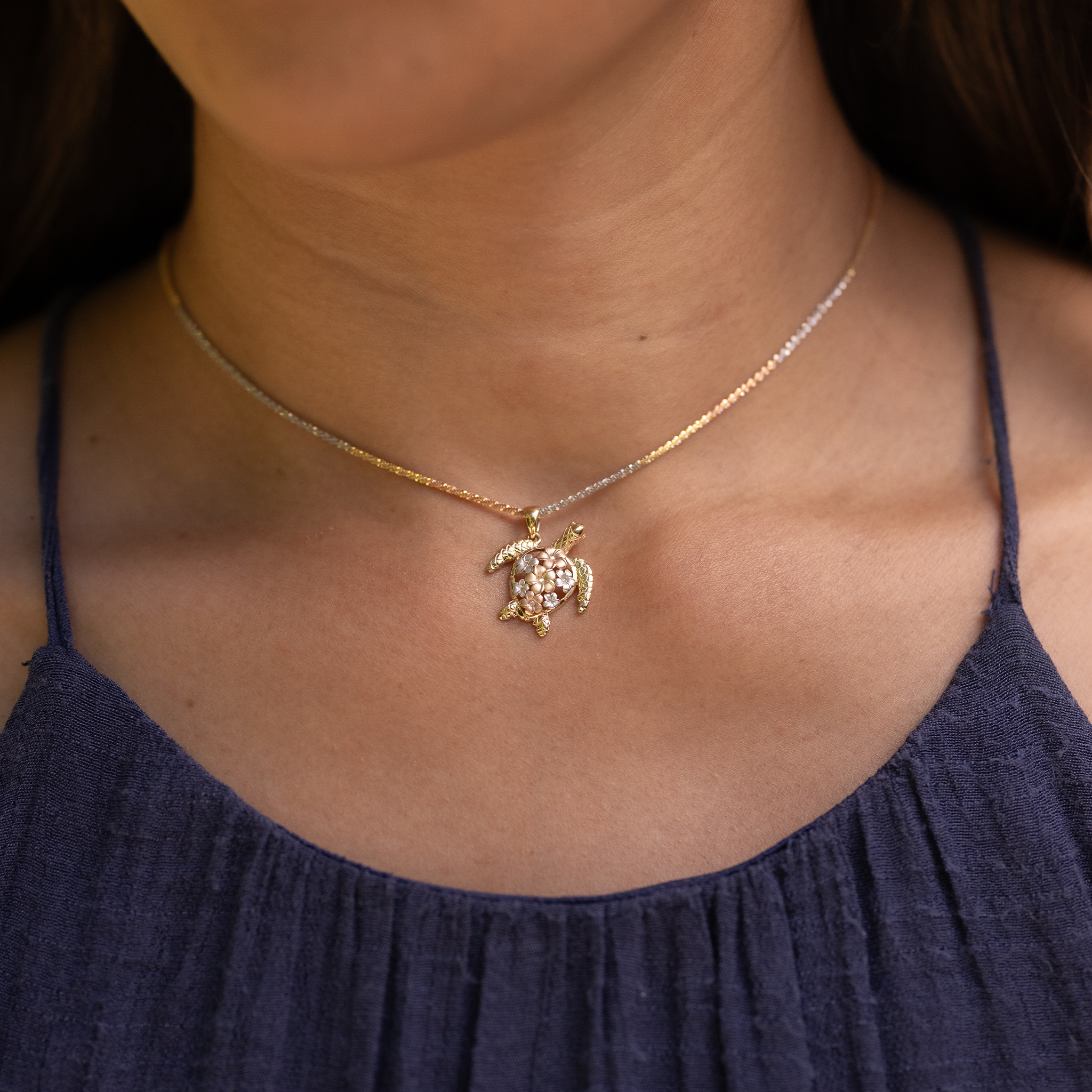 Plumeria Honu (Turtle) Pendant in Tri Color Gold with Diamonds - 18mm