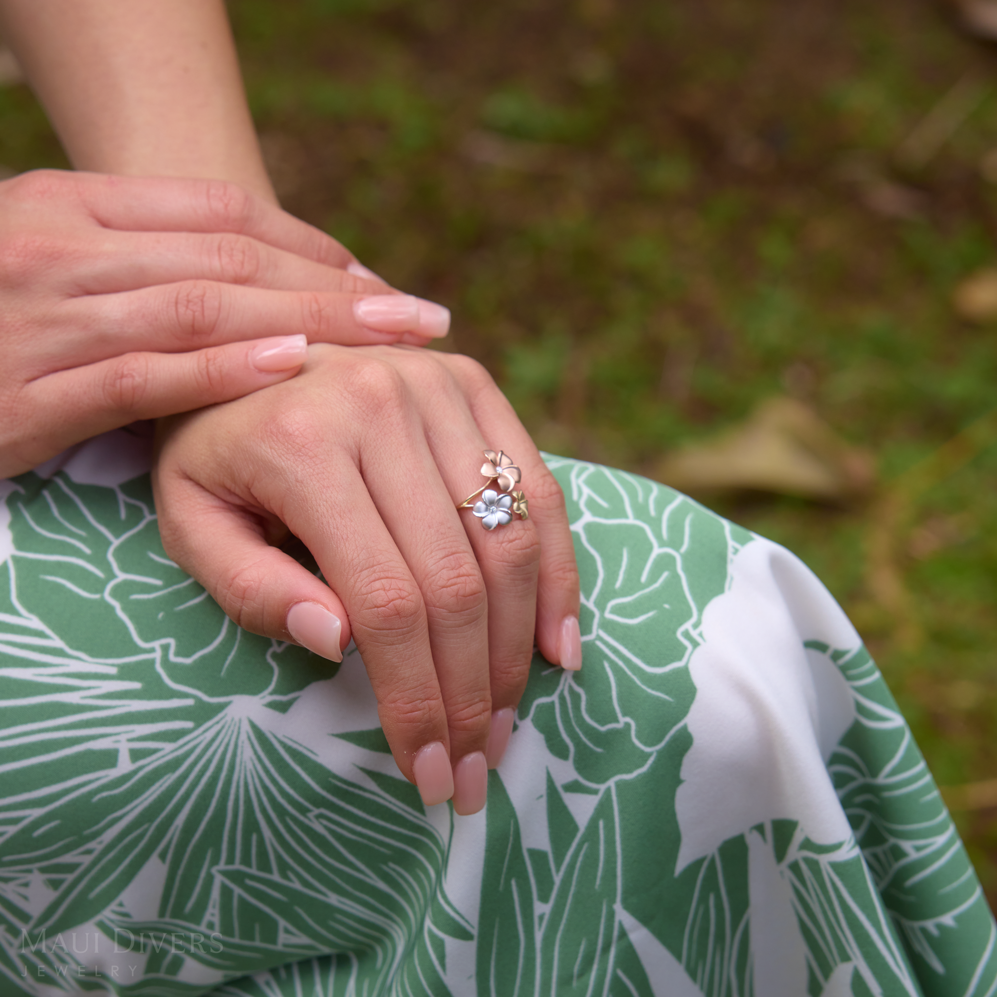 Plumeria Ring in Tri Color Gold with Diamonds - 12mm