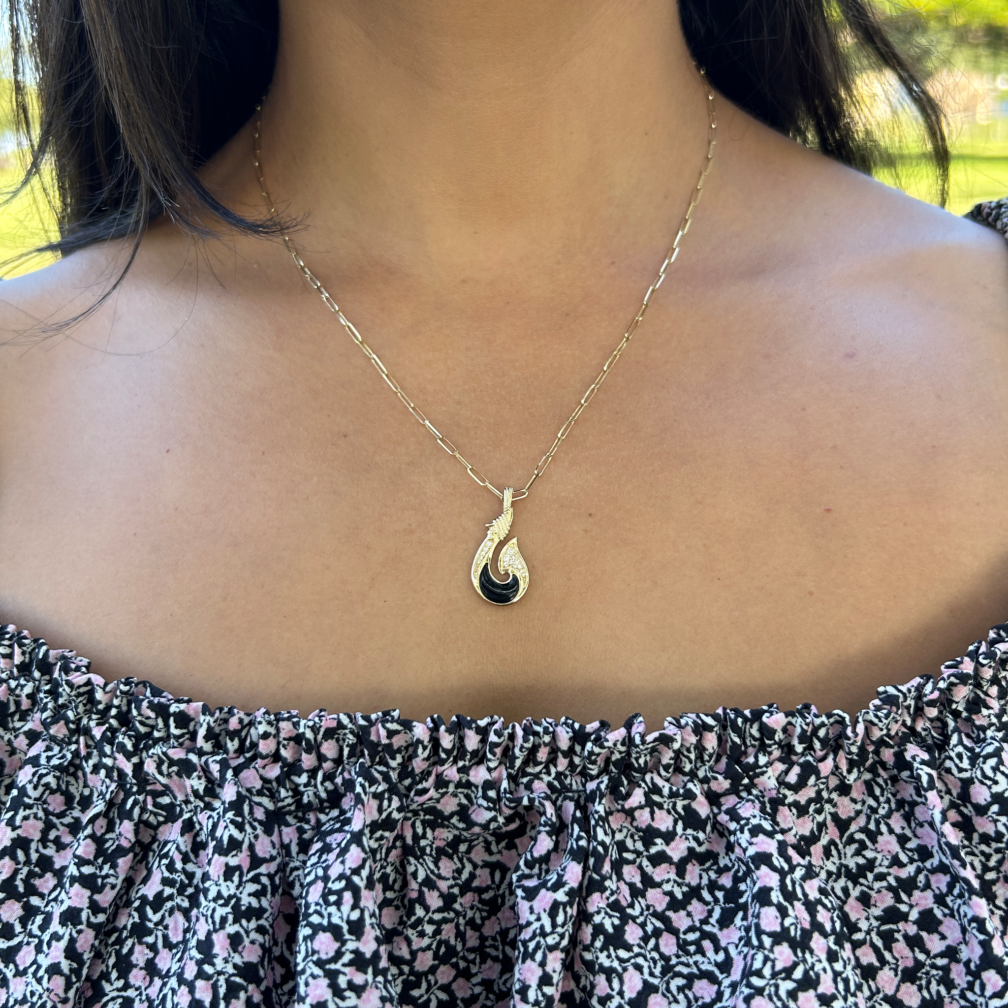 Sealife Fish Hook Black Coral Pendant in Gold with Diamonds - 27mm