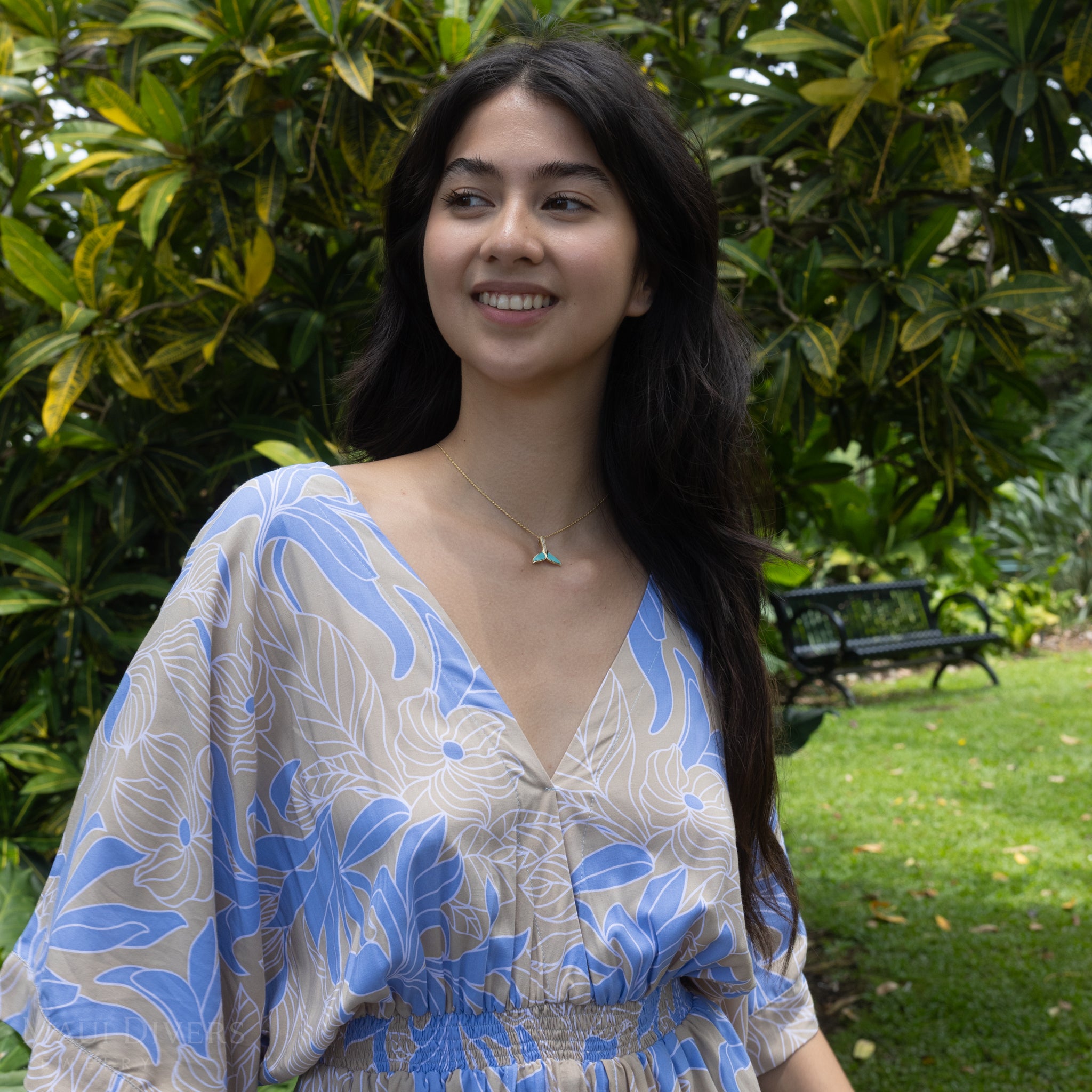 The Sealife Collection Whale Tail Turquoise Pendant in Gold with Diamonds - 22mm is inspired by the breathtaking whale watching season in the Islands of Hawaiʻi. The glowing blue turquoise highlights the whale tail, as diamonds represent the sparkling waters from breaching whales.