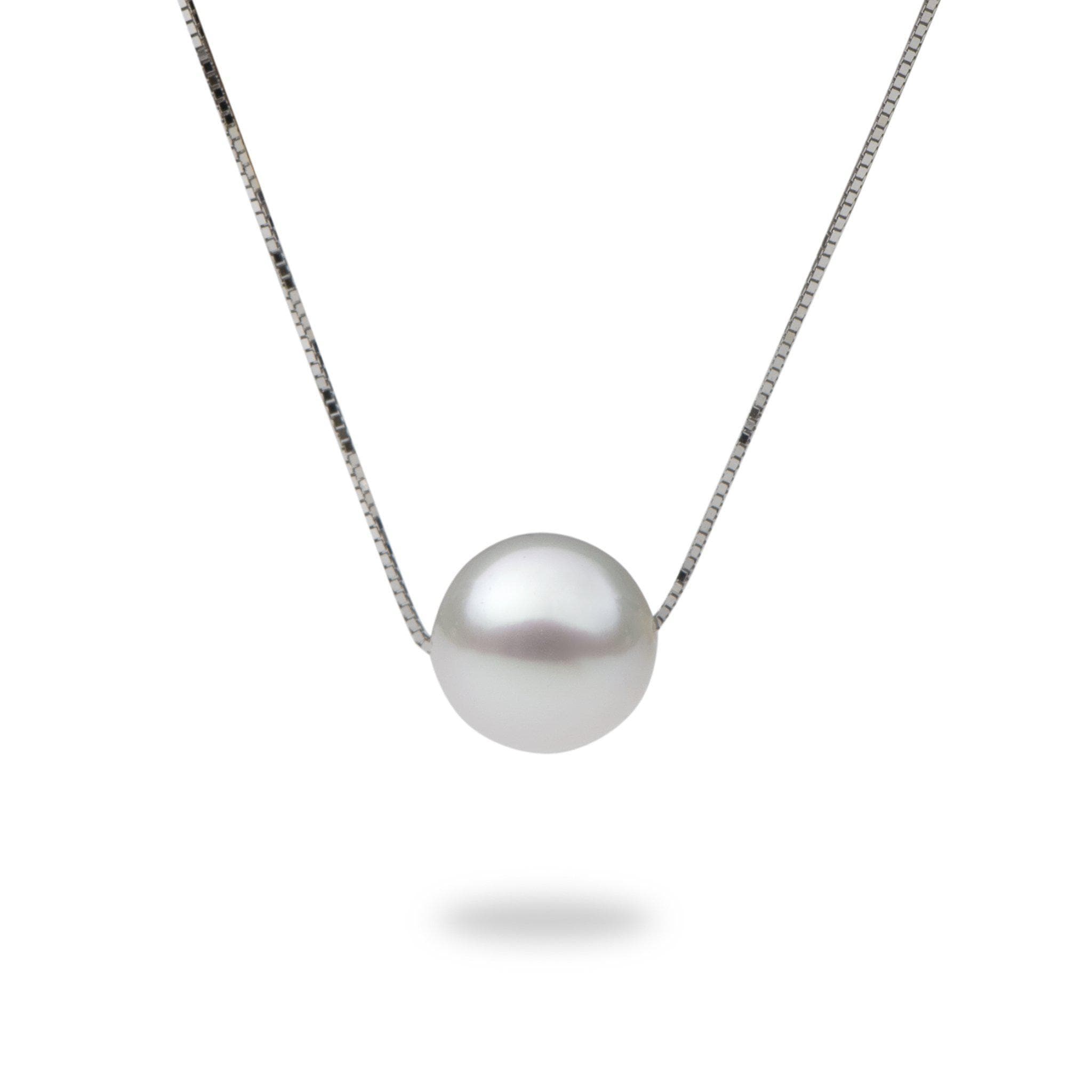 The simple and elegant pearl necklace in 14k white gold features a stunning 9-10mm South Sea white pearl on a sleek adjustable box chain.