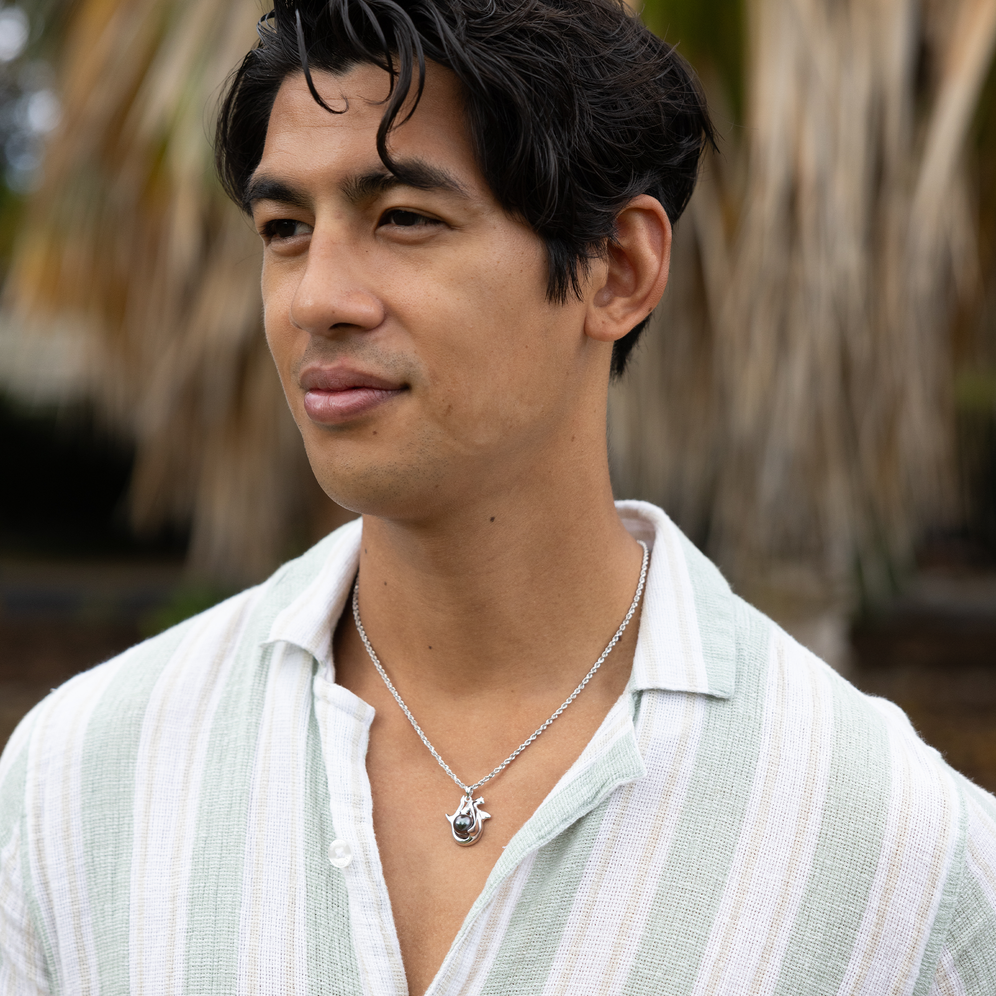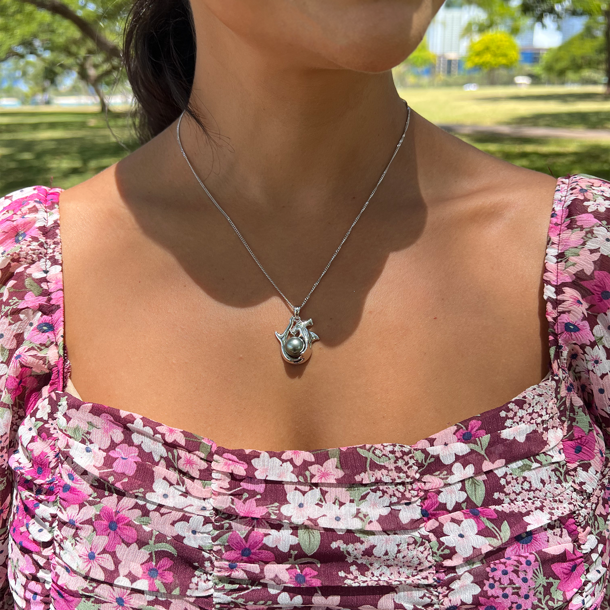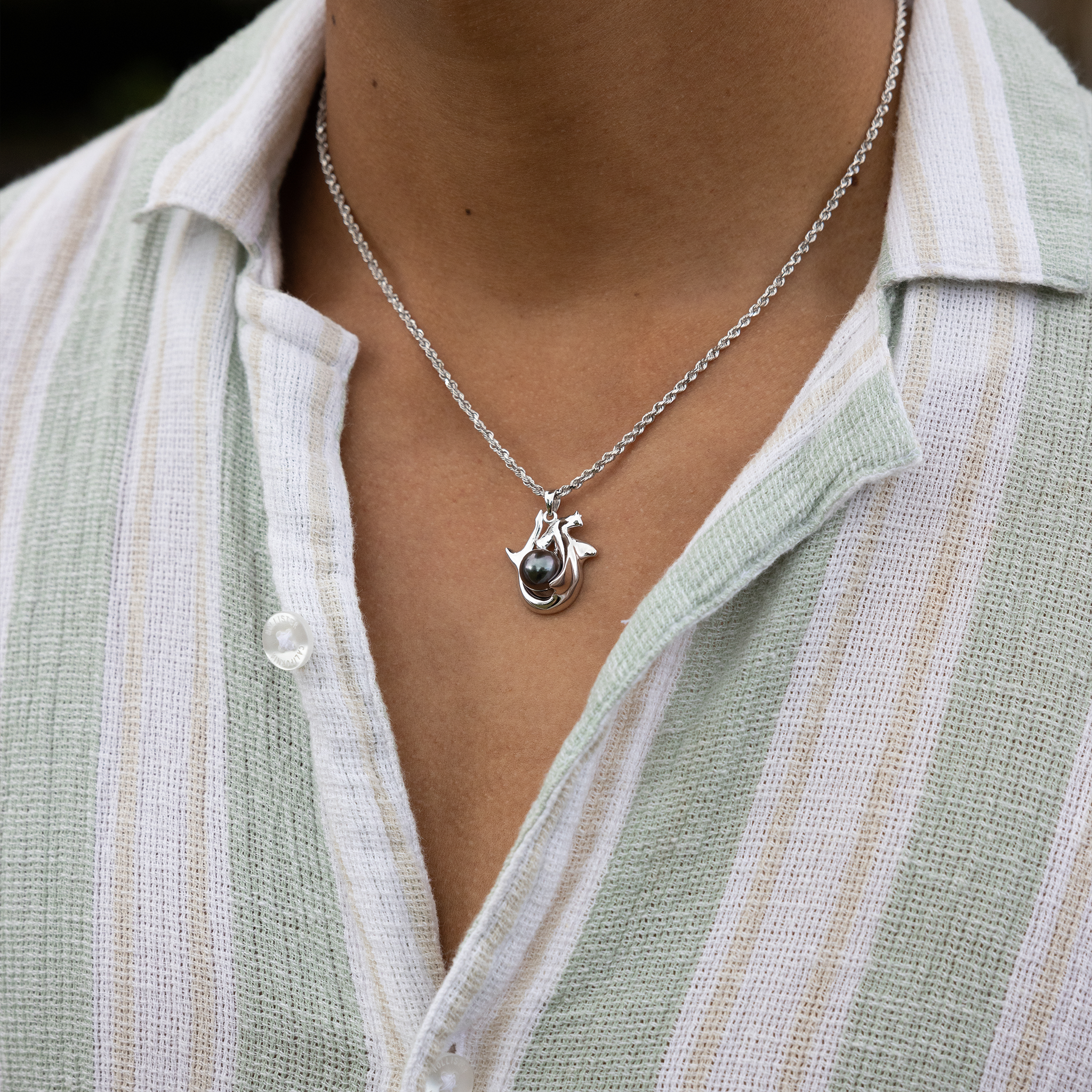 The Hammerhead Shark Pendant represents strength and fearlessness. The sleek 14k white gold pendant beautifully captures the Hammerhead Shark, holding a Tahitian Black Pearl.