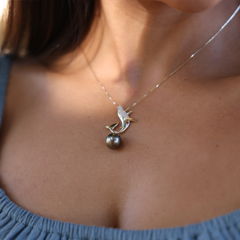 Ocean Dance Whale Tahitian Black Pearl Pendant in Gold with Diamonds - 9-10mm